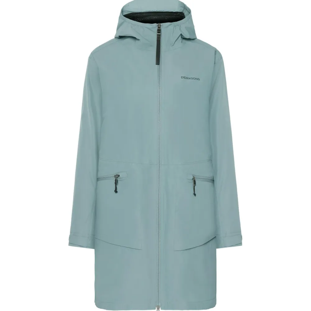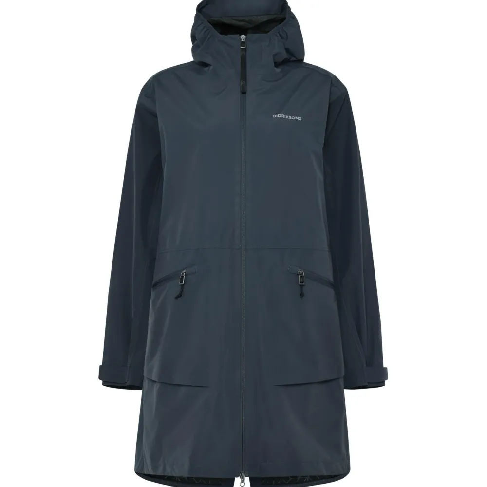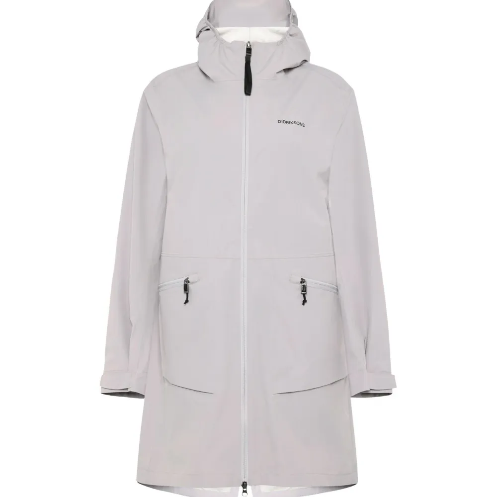 Der Women’s Eliana Parka von Didriksons eignet sich für eine Vielzahl von Unternehmungen. Mit ihm kannst Du stundenlange Ausflüge in die Natur und Berge planen und musst Dir dabei keine Sorgen um das Wetter machen. Das moderne und dennoch klassische Design kann vielseitig kombiniert werden und fällt dabei schon von Weitem ins Auge. Der Logoprint zieht alle Blicke auf sich und ergänzt den Look des Mantels. Die beiden Fronttaschen mit Reißverschluss bieten Platz, um wichtige Dinge schnell und sicher zu verstauen.