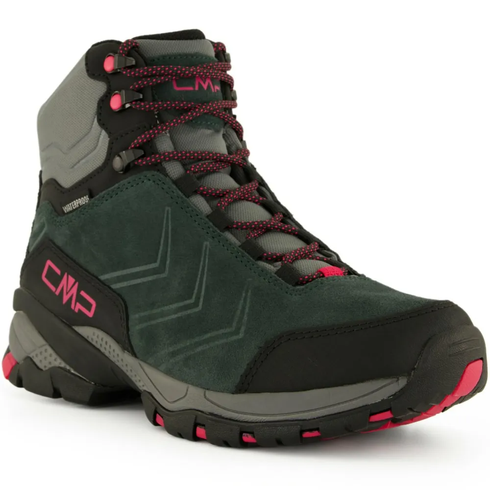 Die Women’s Melnick Mid Trekking Shoes Waterproof Wanderschuhe von CMP bestehen aus Veloursleder, Polyester und robusten Verstärkungen aus Gummi. Eine Kombination aus dämpfender EVA Sohle, TPU, Ortholite Brandsohle und griffiger Gummi CMP FullOn GRIP Sohle sorgt für ein angenehmes Laufgefühl im Gelände. Eine präzise Schnürung in zwei Zonen und praktische Anziehschlaufen an der Ferse machen die wetterfesten Wanderschuhe von CMP komplett.