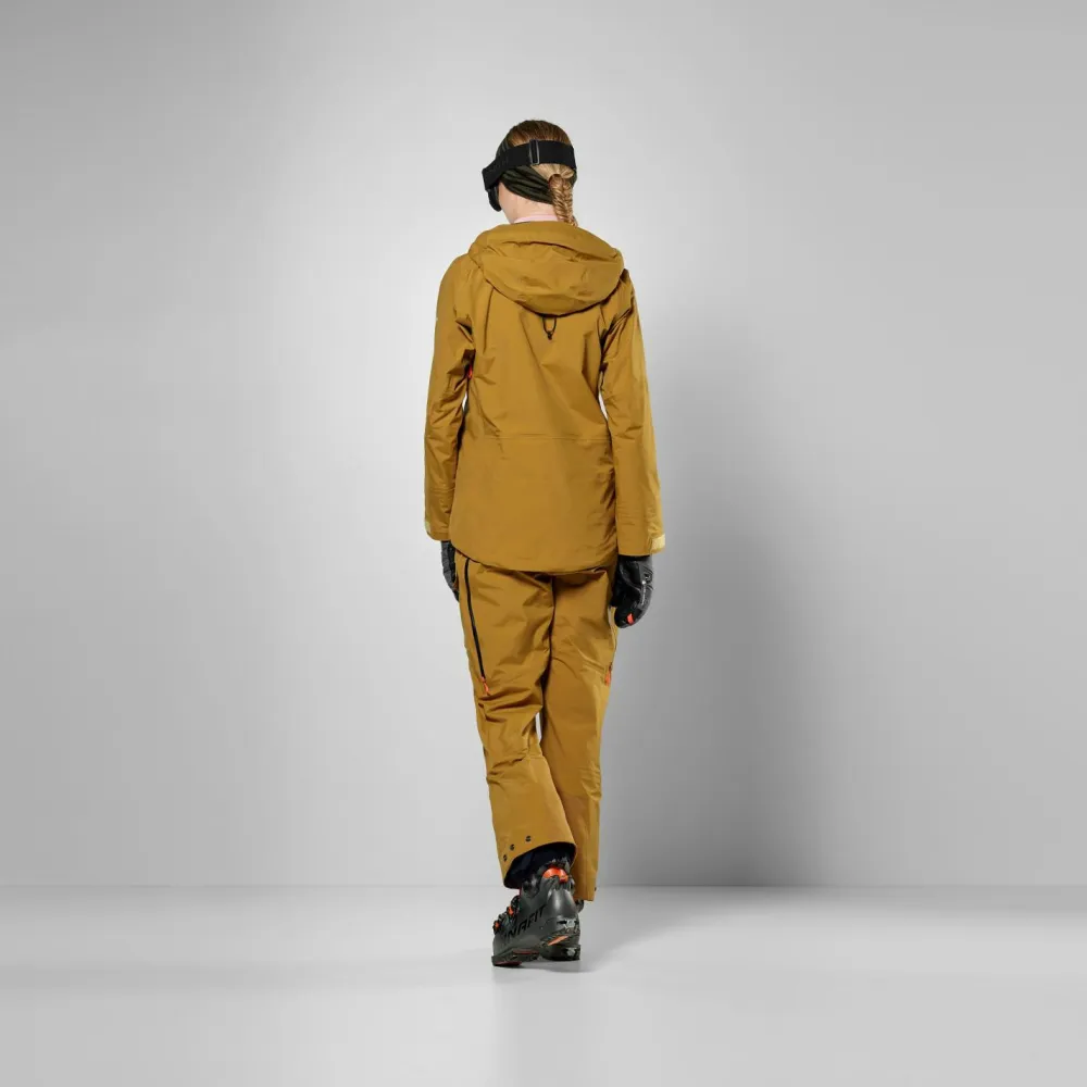 Salewa stattet die Women’s Sella Free 3L PTX Jacket mit hohem Kragen, helmtauglicher Kapuze und integriertem Schneefang aus. Außerdem ergänzen zwei Frontaschen mit wasserabweisenden Reißverschlüssen und zwei Brusttaschen mit Direct-Access System für schnelleren Zugriff die Skitourenjacke.