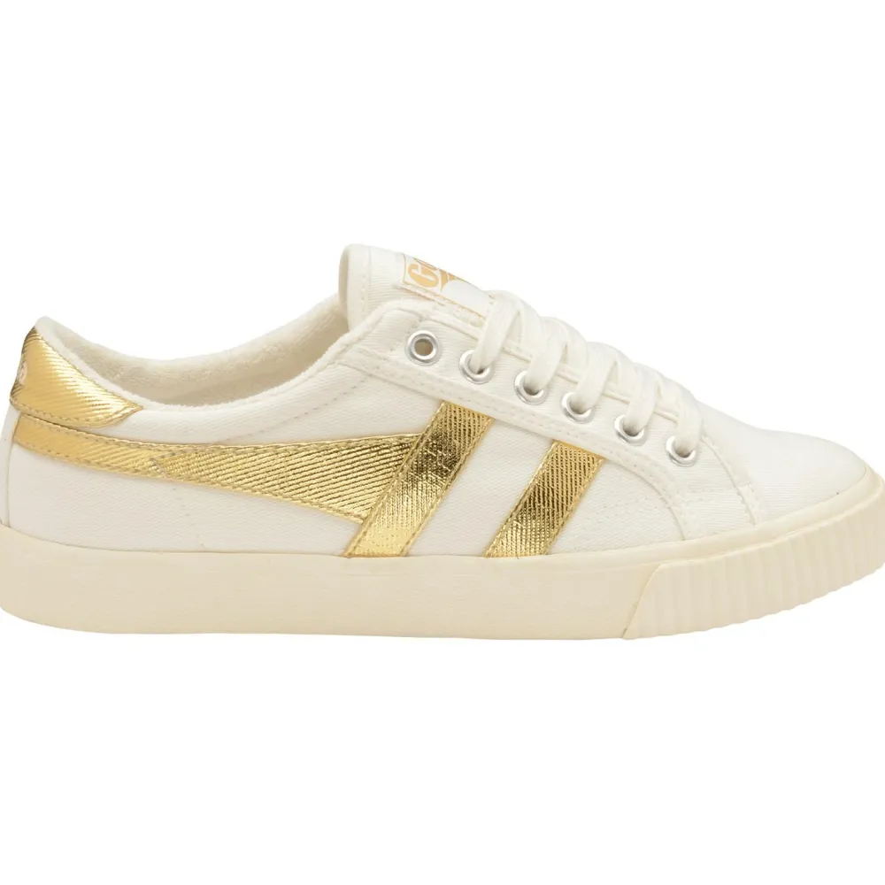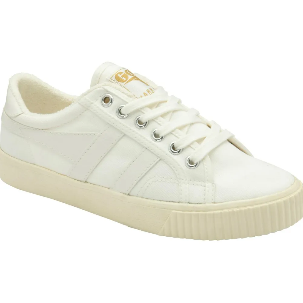 Der Women’s Tennis Mark Cox von Gola ist an das Schuhmodell des Tennisspielers Mark Cox angelehnt, welches er 1975 getragen hat. Die Kombination aus cremeweißem Stoff mit blauen Kunstlederapplikationen und den goldenen Gola-Schriftzügen auf der Zunge sowie der Ferse sorgen für einen richtig coolen Retro-Look. Er passt somit perfekt zu dem Stil, den Gola-Sneaker verkörpern möchten.