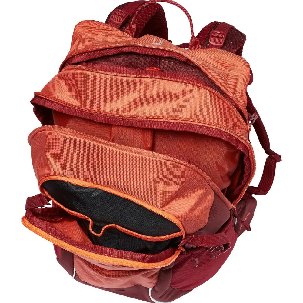Das Hauptfach ist übersichtlich unterteilt und bietet insgesamt 18 Liter Packvolumen. Zusätzlich gibt’s ein Front-Organizerfach, ein Fach fürs Trinksystem, ein herausnehmbares Wertsachenfach, zwei Mesh-Seitentaschen, eine Schlüsselhalterung, eine Helmhalterung und eine Rücklichtbefestigung.