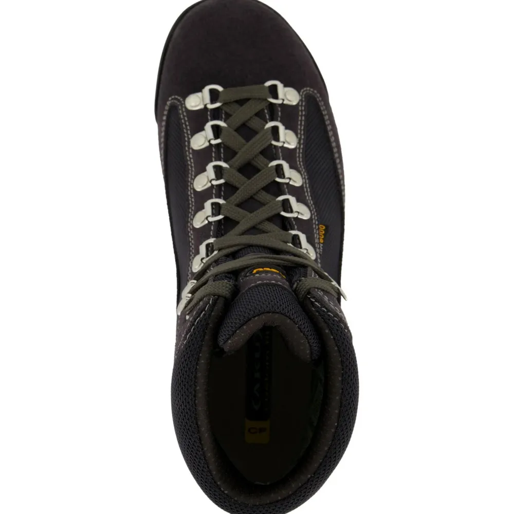 Seit 30 Jahren in Italien ein beliebter Klassiker und immer noch up to date! Das ist fast schon wie ein Qualitätssiegel und spricht für die hervorragenden Eigenschaften des knöchelhohen Women’s Ultralight Micro GTX von AKU zum Wandern, hier als Frauenmodell. Die Farbkompositionen des Schuhs werden stets aktualisiert, so dass die Modelle neben der bewährten Funktionalität und dem Gehkomfort eine wahre Freude sind für die modebewusste Frau am Berg und im Tal. Sie passen zu den jeweils modisch aktuellen Farben der Outfits.Wie der Name besagt, ist der Schuh ein Leichtgewicht und weist alle Vorzüge eines GORE-TEX Schuhes auf, also: Wasser- und Winddichtigkeit sowie Atmungsaktivität. Für eine ausgezeichnete Atmungsaktivität sorgt neben der Membran die Konstruktion des Obermaterials, das AKU-System 8000. Es wurde bereits 1991 entwickelt und – da wirklich innovativ und richtungsweisend – patentiert. Laut firmeneigenen Labortests ist die Atmungsaktivität dabei bis zu 11,5 Mal höher als bei normalen Standards mit GORE-TEX. Auch heute zählt diese Konstruktion des Obermaterials noch zu den besten Technologien bei leichten Wanderschuhen, wenn es um eine hohe Atmungsaktivität geht.Hinzu kommen die gute Passform und der Grip der Vibram Sohle Erica Everest, der zwar nicht für den Everest reicht, aber für mittelschweres Gelände ideal ist. Der Aufbau des Schuhs bietet genügend Halt und eine gute Seitenstabilität. Ob man nun leichtfüssig wie ein Reh durch die Wälder und Auen sprintet, als Hobby-Älplerin hinter den Kälbern herrennt, den Schuh als Landschaftsgärtnerin trägt oder in den warmen Regionen der Erde damit pilgert – der Women’s Ultralight Micro GTX passt immer und überall.