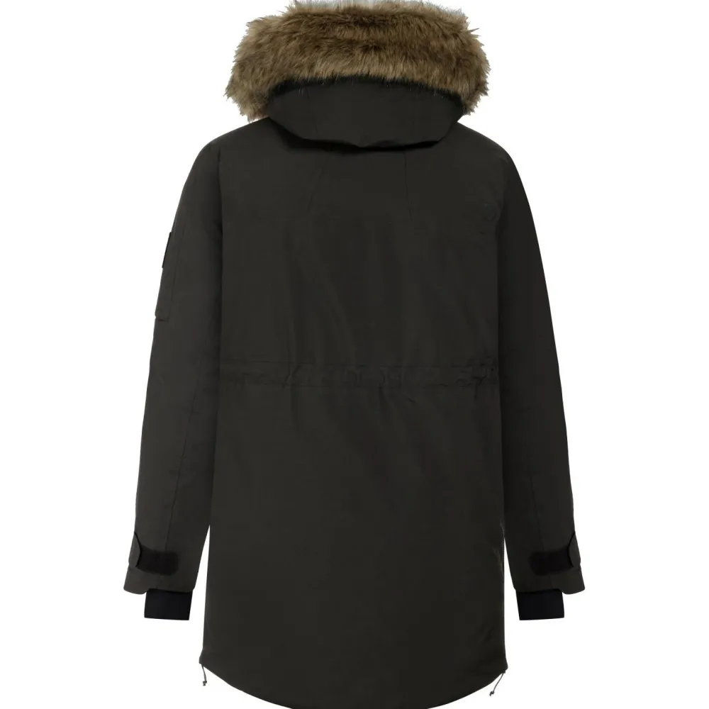 Die Kapuze ist zweifach verstellbar und sorgt mit einem abnehmbaren Kunstpelz für ein optisches Highlight. Der Sitz an der Hüfte ist am Rücken verstellbar. Die Ärmelabschlüsse lassen sich per Klettverschluss regulieren und sind an der Innenseite elastische eingefasst und mit praktischen Daumenlöchern versehen. Ordentlich viel Taschen für den nötigen Stauraum sind natürlich auch dabei. Stark!