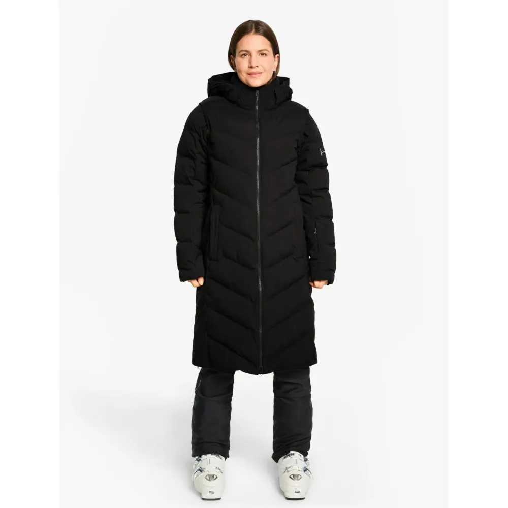 Die Wattierung mit Comfortemp bietet angenehme Wärme bei gleichzeitig geringem Gewicht. Ein elastisches Innenfutter sorgt für optimale Bewegungsfreiheit, während der ergonomische Schnitt sportlich wirkt. Praktische Features wie die feste, verstellbare Kapuze und die Skipasstasche machen den Mantel zum idealen Begleiter für Alltag und Piste.