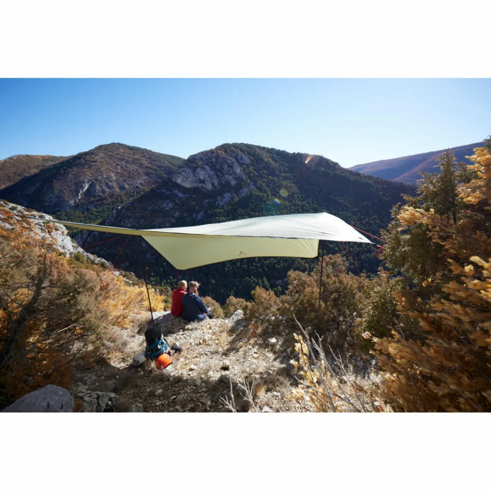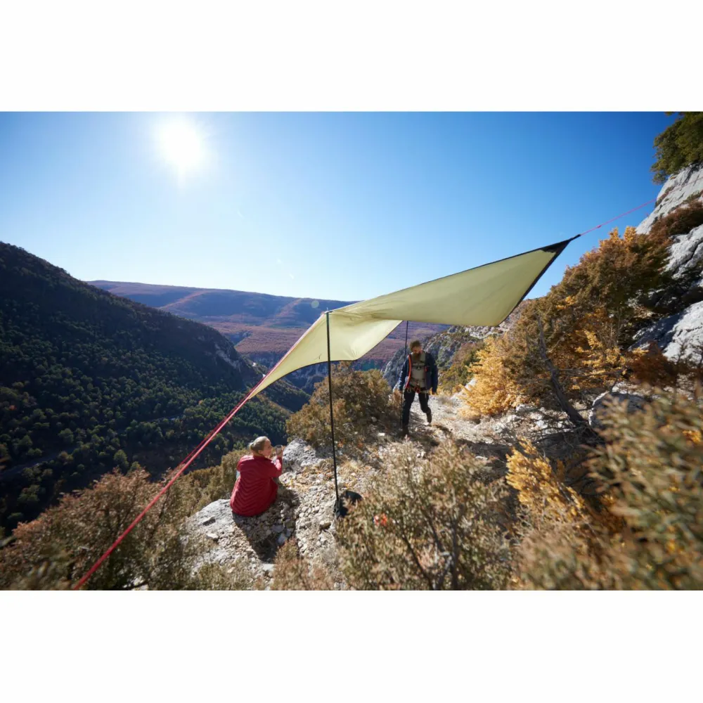 Ganze 4 x 4 m misst die Zeltpane des Zuni 4 Tarp von Grand Canyon. Damit bietet das wetterfeste Tarp gleich mehreren Wanderern bequem Schutz vor Regen und Sonne. Dafür hat Grand Canyon das 68D 190T Polyester Gewebe mit einer wasserdichten PU-Beschichtung ausgestattet. So widersteht es einer 3000 mm Wassersäule und steht damit einer hochwertigen Zeltplane in keiner Weise nach. Das große Tarp kommt komplett mit zwei 250 cm langen Stahlstangen, Stahlheringen und reflektierenden Abspannleinen.