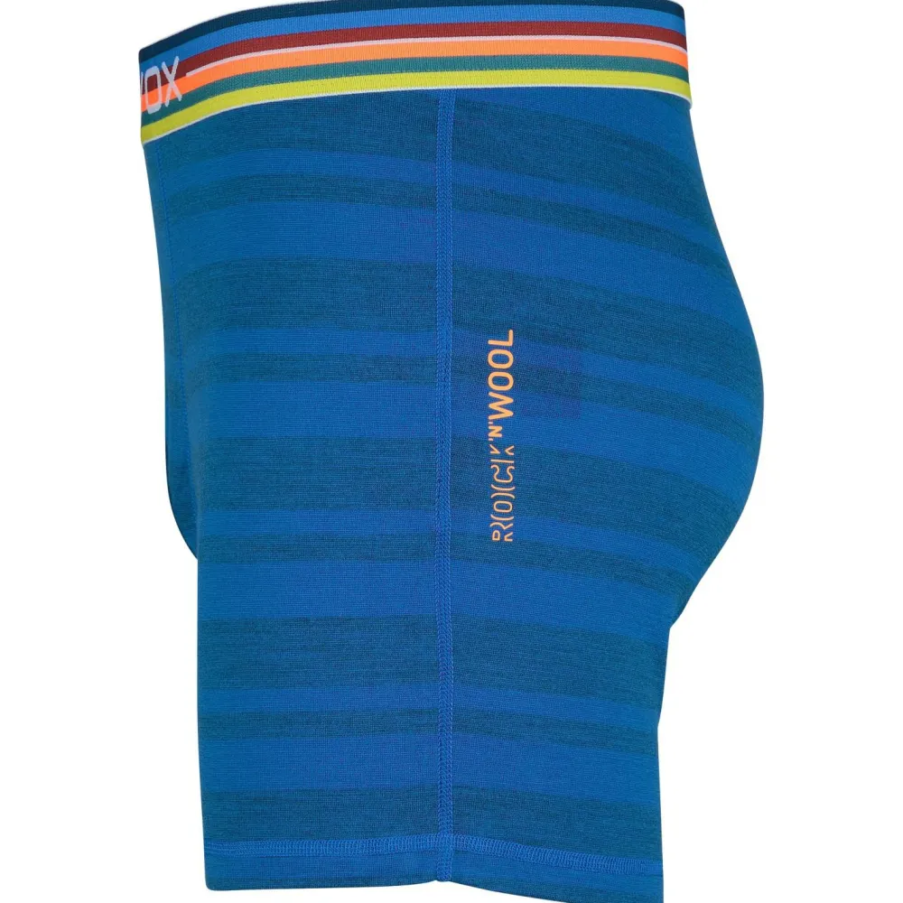 Dress to impress – die 185 Rock ‚N‘ Wool Boxer von Ortovox kommt im farbigen Design mit bunt gestreiftem Hüftbund!