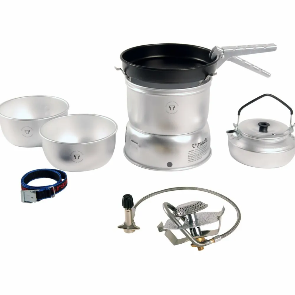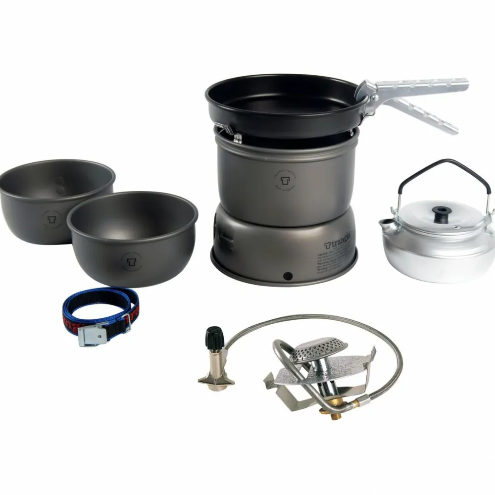 Die Kocherserie 25 Ultralight von Trangia umfaßt Kocher, die sich bestens dafür eignen, für drei bis vier Personen zu kochen. Mit hochgeklappten Halterungen im oberen Windschutz der Sets, kann zudem das größere Kochgeschirr aus dem Trangia Sortiment verwendet werden. Die Sets gibt es außerdem in zwei Varianten: in Ultralight Aluminium und Ultralight Aluminium Hardanodized. Der Trangia 25-4 besteht aus zwei Töpfen (1,75 l und 1,5 l), einer Non-Stick beschichteten Bratpfanne (Ø 22cm), oberem und unterem Windschutz, Primus Gasbrenner, Zange, Riemen und zusätzlich einem Wasserkessel mit 0,9 l Fassungsvermögen.Sämtliche Sturmkocher der Trangia 25 Serie sind auch mit Spiritusbrenner erhältlich.Die Variante Ultralight wird aus einer neuen Aluminiumlegierung hergestellt, die zu 50% stärker ist, als herkömmliches Aluminium. Das erlaubt den Bau von dünnwandigeren und damit leichteren Gefäßen. Deshalb punkten die neuen Trangia Modelle mit einem Gewichtsvorteil von bis zu 25% im Vergleich zu ihren Vorgängern!Ultralight Hardanodized ist eine ausgesprochen verschleißfeste Aluminiumlegierung. Durch Hartanodisierung erhöht sich die Kratz- und Verschleißfestigkeit, sowie die Korrossionsbeständigkeit. Diese Oberflächenbehandlung erleichtert zudem die Reinigung der Gefäße! Aufgrund seiner hervorragenden Eigenschaften ersetzt dieses Material sowohl die Titanium-, als auch die Duossal-Kocher.Non-Stick ist eine Beschichtung, die sich besonders gut zum Braten mit und ohne Fett eignet. Nichts brennt an, was zusätzlich die Reinigung erleichtert. Non-Stick ist allerdings etwas empfindlicher gegen Kratzer und Verschleiß, weshalb es sich empfiehlt, nur Kuststoff- oder Holzbesteck zu verwenden.