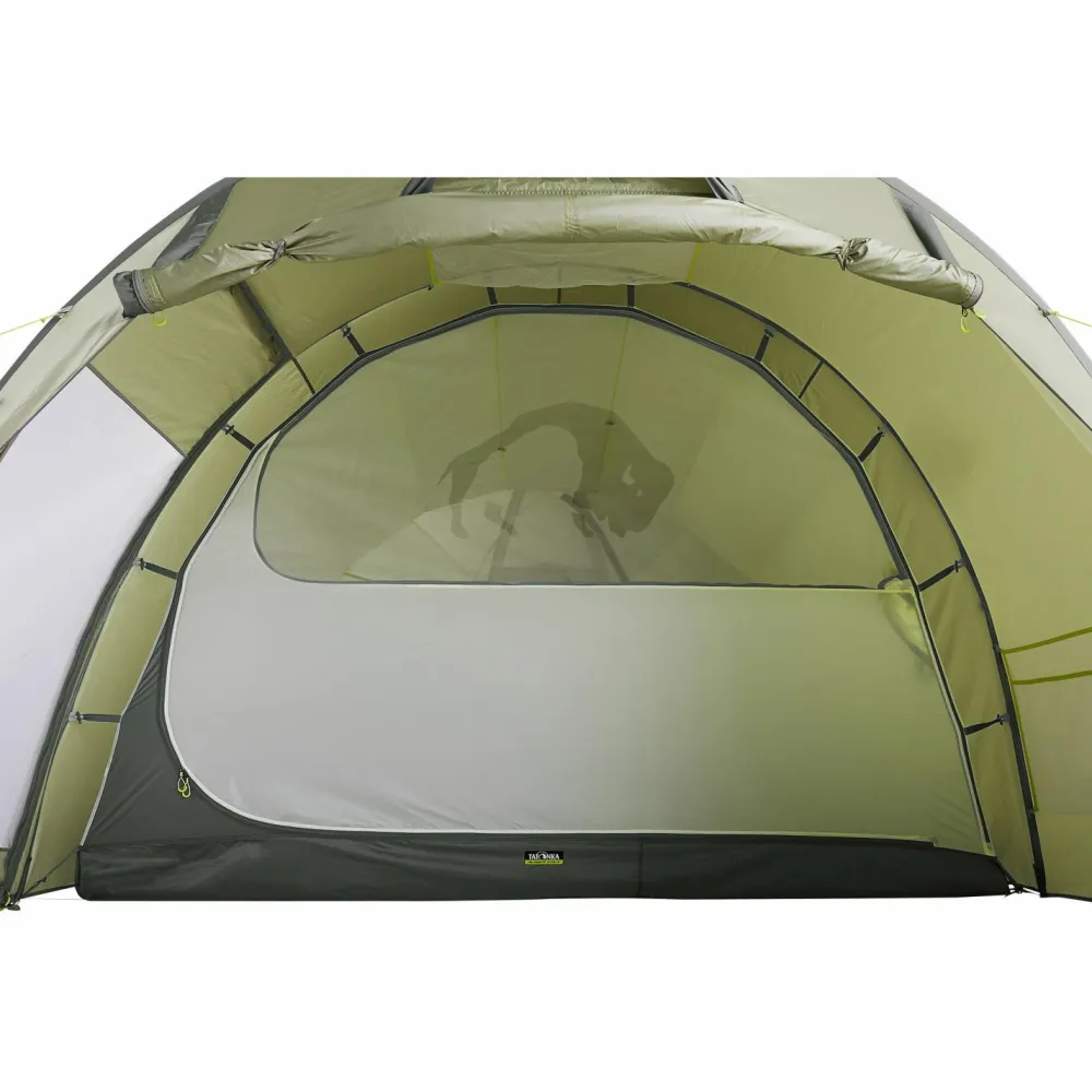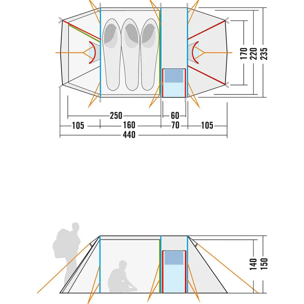 Getragen wird die Tunnelkonstruktion von eloxierten Aluminium Zeltstangen aus 7001 T6 Aluminium in 11 mm Stärke. Das Zelt ist mit drei Eingängen ausgestattet und bietet im Schlafraum bequem Platz für drei Personen. Praktische Details, wie die vier Einstecktaschen im Innenzelt, Reflektoren an den Zeltleinen und eine Wäscheleine im Innenzelt machen das Zelt zum idealen Base-Camp für Touren, Trekking und Camping. Dabei bietet der große Vorraum genügend Platz für sämtliches Gepäck. Praktische Packhilfen für die Zeltleinen und separate Packsäcke für Zelt und Gestänge runden die ausgeklügelte Zeltkonstruktion gekonnt ab.