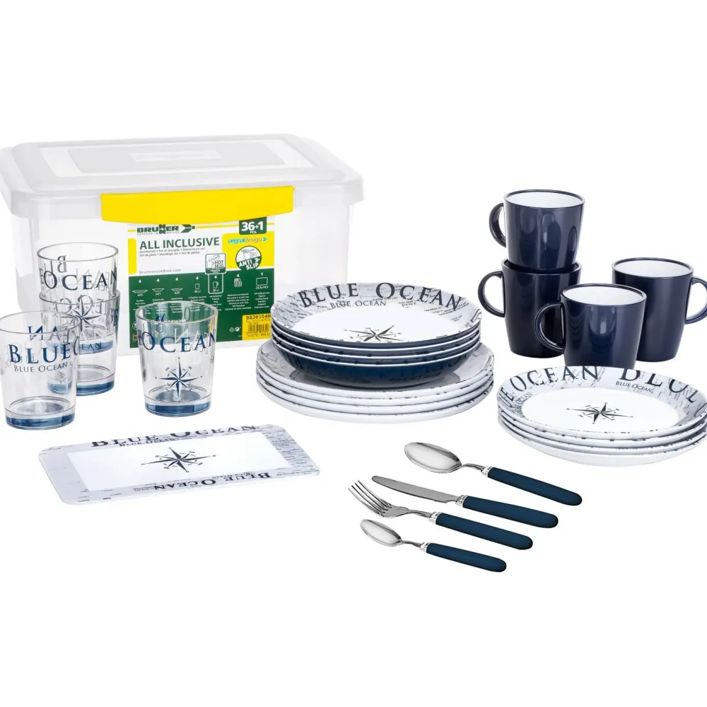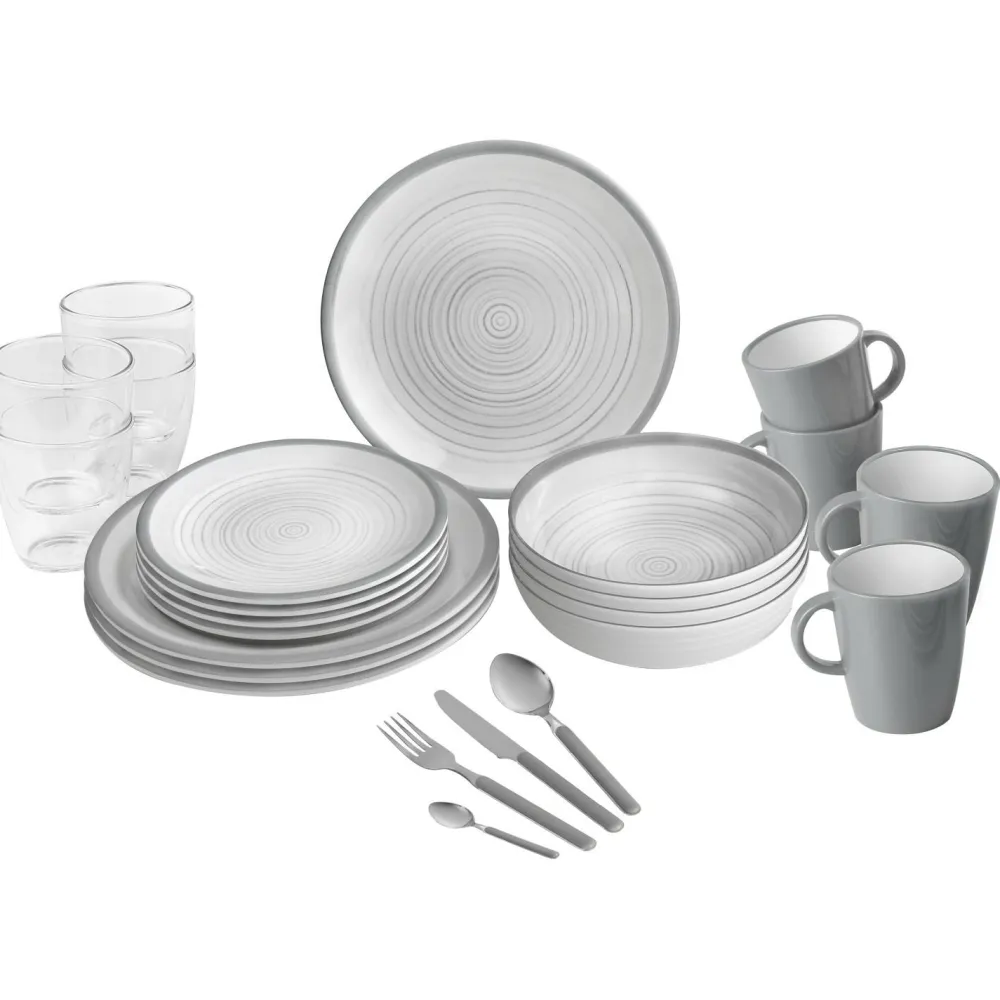 - 4 x tiefe Teller 20 cm; 4 x flache Teller 20 cm; 4 x Teller 25 cm; 4 Tassen 30 cl, 4 Becher 20 cl, 16 x Besteck