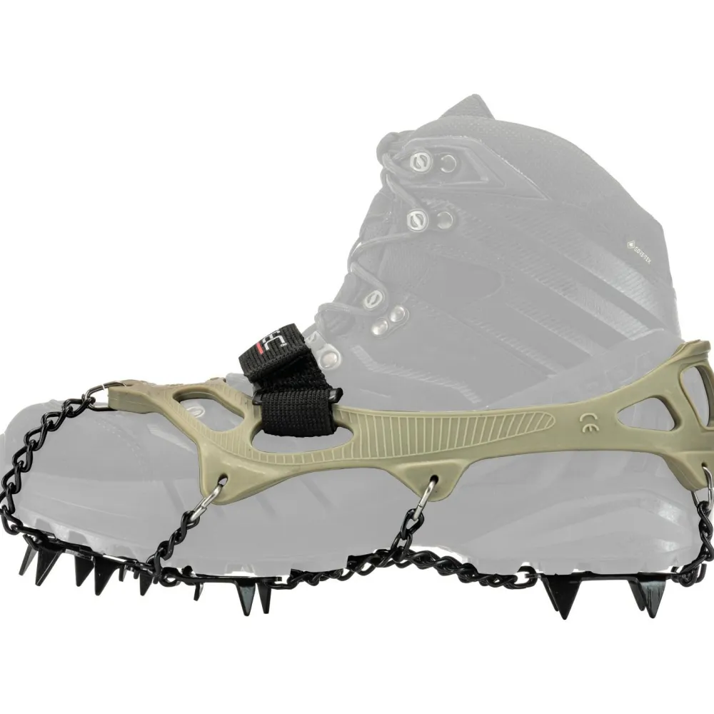 Dank Klettverschluss sitzen die Grödel perfekt am Schuh! Der Frontbügel auf der Schuhspitze liefert beim Gehen noch mehr Stabilität. Die vorderen Steigeisen sind abgegliedert, damit Schneeansammlungen und die Bildung von Eisklumpen unter den Schuhen verringert werden.