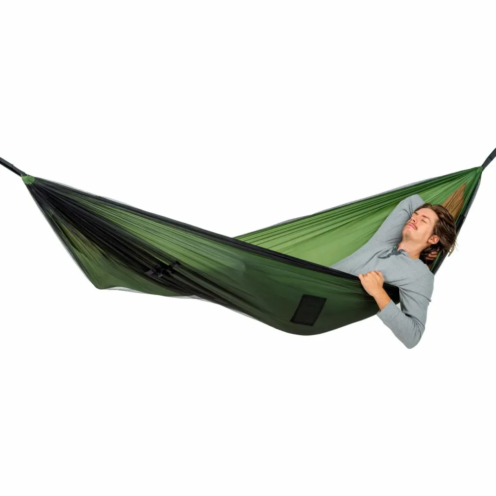 Bereit für Übernachtungen unter einem tropischen Sternenhimmel: mit der Amazonas Hängematte Moskito-Adventure Thermo! Die Hängematte bietet neben dem Moskitonetz darüber noch ein extra Fach für eine Isomatte. Diese lässt sich einfach integrieren und sorgt für zusätzliche Wärme in kühleren Nächten! Sie ist nicht im Lieferumfang enthalten. Die Hängematte selbst besteht aus sehr robustem, atmungsaktivem Material mit einer Imprägnierung, die Insekten fernhält! Für den menschlichen Körper ist sie jedoch völlig unbedenklich. Durch die mitgelieferten Spreizstäbe bietet die Hängematte viel Platz im Innenraum und kann mit oder ohne Moskitonetz benutzt werden! Die Hängematte Moskito-Adventure Thermo bietet ein kleines Packmaß, ein geringes Gewicht und zuverlässigen Schutz vor Insekten und Kälte von unten.