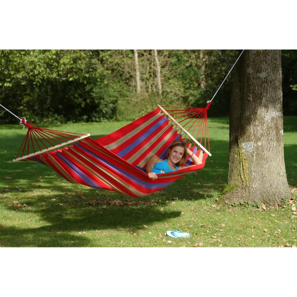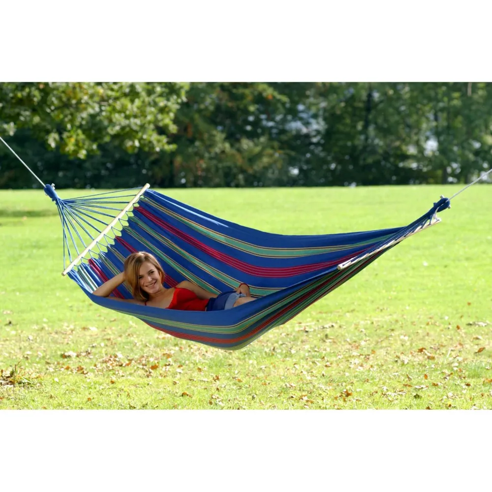 Die Aruba Hängematte von Amazonas kann Dich in Deinem Campingurlaub begleiten, Du kannst sie aber auch einfach in Deinem Garten oder in Deinem Zimmer aufhängen und so auch zu Hause ein Urlaubsgefühl schaffen.Dank des wetterfesten und UV-beständigen Materials kannst Du die Aruba Hängematte auch den ganzen Sommer über draußen hängen lassen, ohne dass sie davon Schaden nimmt.