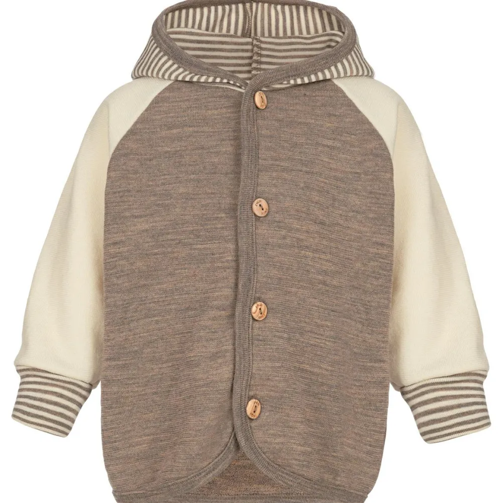 Mega niedlich, super bequem und bereit für die ersten Abenteuer: mit der Baby-Kapuzenjacke mit Holzknöpfen von Engel können die ganz kleinen auf ganz große Entdeckungstour starten! Die Kapuzenjacke ist aus einem superweichen, atmungsaktiven und temperaturregulierenden Gewebe aus feinster Schurwolle gefertigt und stammt zu 100% aus nachhaltiger und ökologischer Produktion. Die durchgehende Knopfleiste ist mit schicken Holzknöpfen versehen. Ein Streifen in Kontrastfarbe zieht sich durch den Kapuzenrand, die Knopfleiste und den Hüftbund und veredelt zusätzlich die Optik. Die elastischen Ärmelbünde sind extra weich eingefasst. Top!