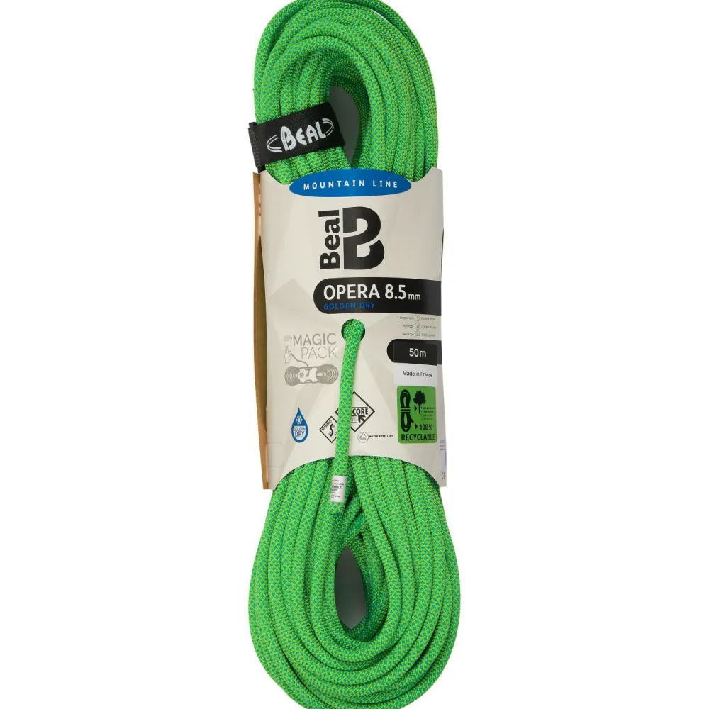 Das Opera 8,5 mm von Beal ist mit nur 48 Gramm pro Meter eines der leichtesten und dünnsten Einfachseile auf dem Markt – das erste unter 50 g/m. Es hat eine Dreifachzertifizierung und ist somit auch als Halb- und Zwillingsseil zugelassen. In diesem Seil hat Beal sein gesamtes Know-how und die besten Technologien vereint. Das Ergebnis ist ein niedriger Fangstoß und ein einzigartiges Handling. Die UNICORE Technologie verhindert einen Mantelrutsch und bietet noch eine zusätzliche Sicherheitsreserve bei einem beschädigten Mantel. Außerdem ist das Seil mit der Golden Dry Kern- und Mantelimprägnierung UIAA Water Repellent zertifiziert und erfüllt damit die höchsten Ansprüche auf Wasserfestigkeit.