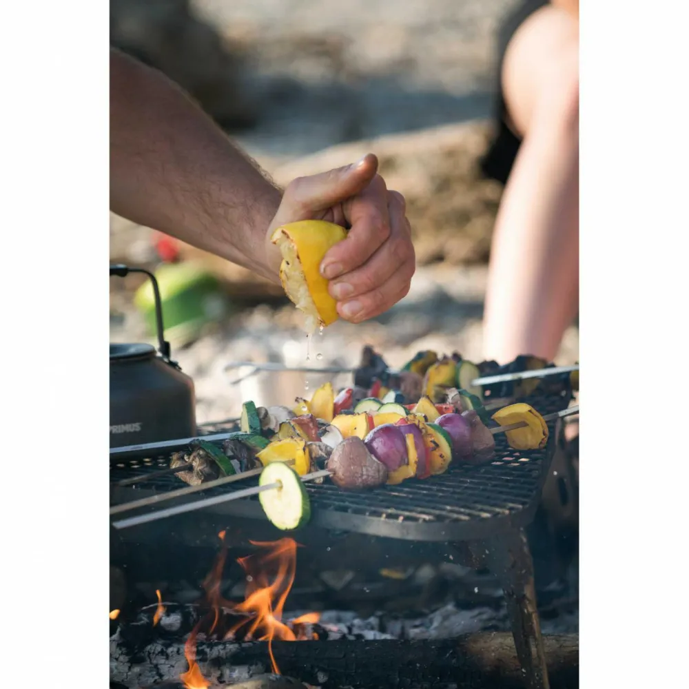 Warme Mahlzeiten und leckeres Grillgut über offenem Feuer: mit dem Aeril Trockenbrennstoffkocher von Primus! Sein stabiler Rost mit Edelstahlrahmen bietet Platz für mehrere Töpfe und Pfannen. Dank seiner Höhenverstellung lässt sich der Abstand zu den Flammen und damit die Kochtemperatur gut regulieren. Der Aeril birgt praktische Vorteile gegenüber einem Standardgrill, denn er ist leichter, stabiler und verschmutzt weniger. Auch im Vergleich zu selbstgebastelten Kochstellen-Konstruktionen bietet er mit seiner verlässlichen Stabilität und Sicherheit Vorteile.Zusammengeklappt lässt sich der Aeril Feuerständer von Primus in der zugehörigen Tasche leicht verstauen und transportieren!