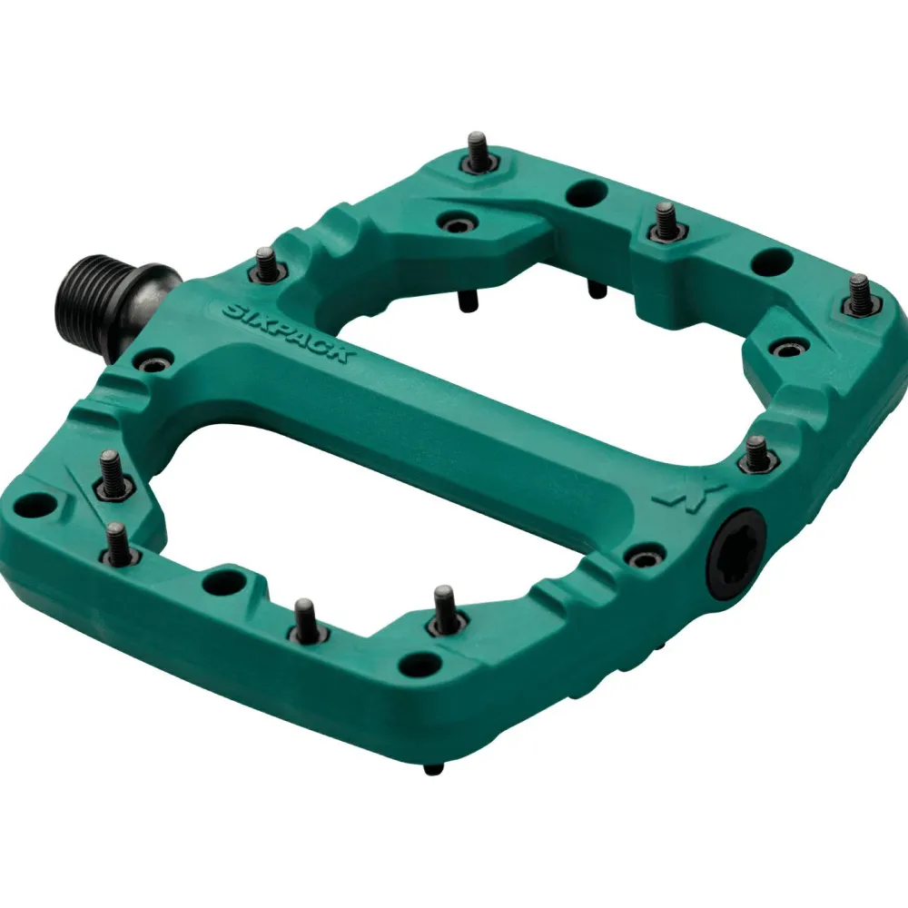 Das sind Sixpack Racing’s Kamikaze PA! Das Ziel bei der Entwicklung war, ein sehr robustes, gleichzeitig aber sehr leichtes Plattform-Pedal zu bauen. Das ist Sixpack Racing mit dem Kamikaze PA gelungen! Der Pedalkörper besteht aus glasfaserverstärktem Polyamid, sodass eine extreme Belastbarkeit bei geringem Gewicht gegeben ist. Die Standfläche ist 105 x 114mm groß, mit vorgeformtem Profil und gespickt mit 18 extra langen Stahlpins pro Seite, die für besten Halt auf dem Pedal sorgen.