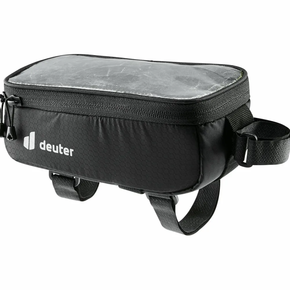 Mit der Phone Bag von deuter habt Ihr Euer Smartphone auf der Radtour immer im Blick und Griff! Die Fahrradtasche ist aus einem zu 100% recycelten Gewebe gefertigt und wird per Klettverschlusssystem sicher am Rahmen fixiert. Das Hauptfach mit umlaufendem Zip bietet ein Volumen von 0,7 Litern und packt Geldbeutel, Energieriegel und Co. ein. Das Smartphone-Fach ist mit einer wasserdichten und durchsichtigen Folie ausgestattet, die dank Touchsensitivität eine problemlose Bedienung des Smartphonedisplays erlaubt. Reflektierende Elemente und eine integrierte Regenhülle machen die Phone Bag komplett. Top!