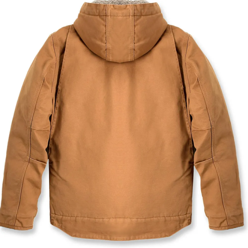 Die Washed Duck Sherpa Lined Jacket von Carhartt überzeugt mit tollen Features und einem besonders coolen Look. Sie besteht aus einem Soft Duck Material aus Baumwolle, dieses verfügt über einen weichen Griff, ist dennoch sehr robust und fest. Die Fütterung sorgt für eine Extraportion Wärme und die mit einem Kordelzug verstellbare Kapuze mit einem kuschligen Sherpa-Futter schützt Kopf, Ohren und Nacken vor kühlem Wind.