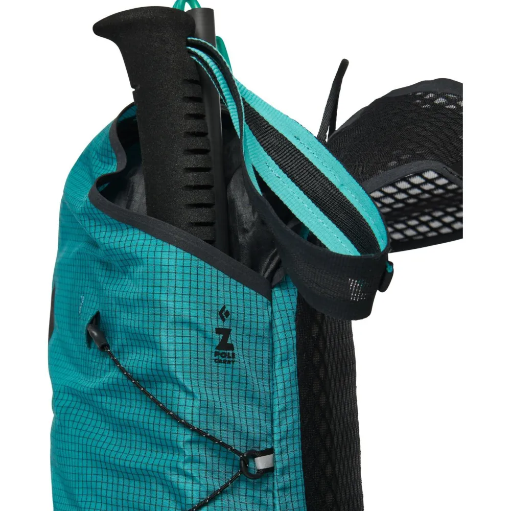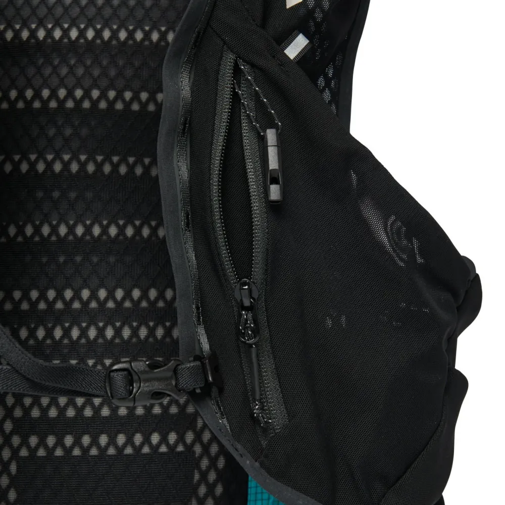 Als Tragesystem dient eine besonders atmungsaktive Einheit aus Schultergurten, Brustgurt und Hüftgurt, die an das Design von Trailrunningwesten angelehnt ist. Der Rucksack verfügt über seitliche Staufächer, ein Innenfach mit Schlüsselclip und zwei elastische Fächer für SoftFlask Flaschen an den Schulterträgern. Seitliche Kompressionsriemen ergänzen den sportlichen Outdoorrucksack.