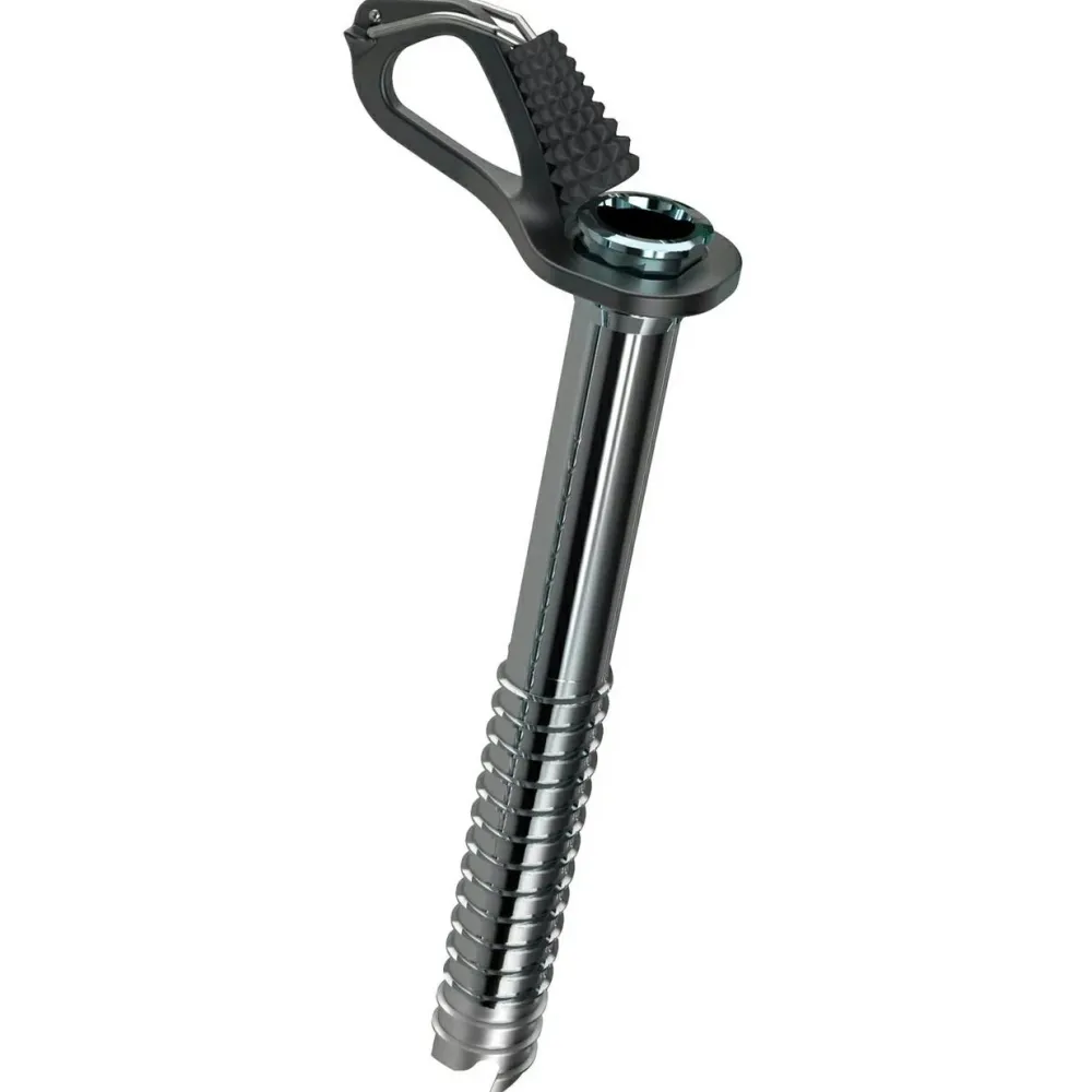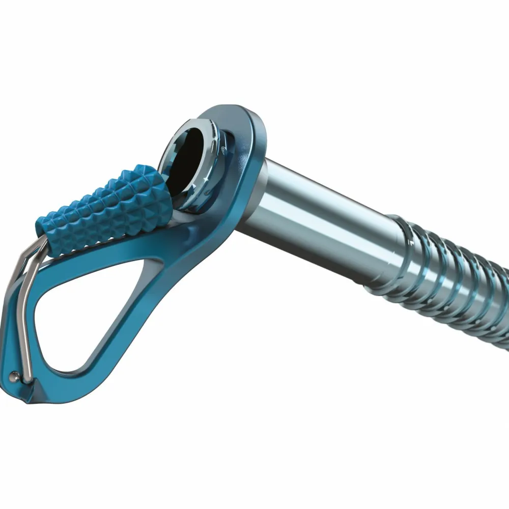 Grund für relativ leichte Gewicht ist die Konstruktion der Eisschraube mit einem Aluminiumkörper und einer Stahlspitze. Mit der einfachen 3-Zahn-Spitze kann man die Eisschraube leicht platzieren und dank der integrierten Kurbel einfach hineindrehen.