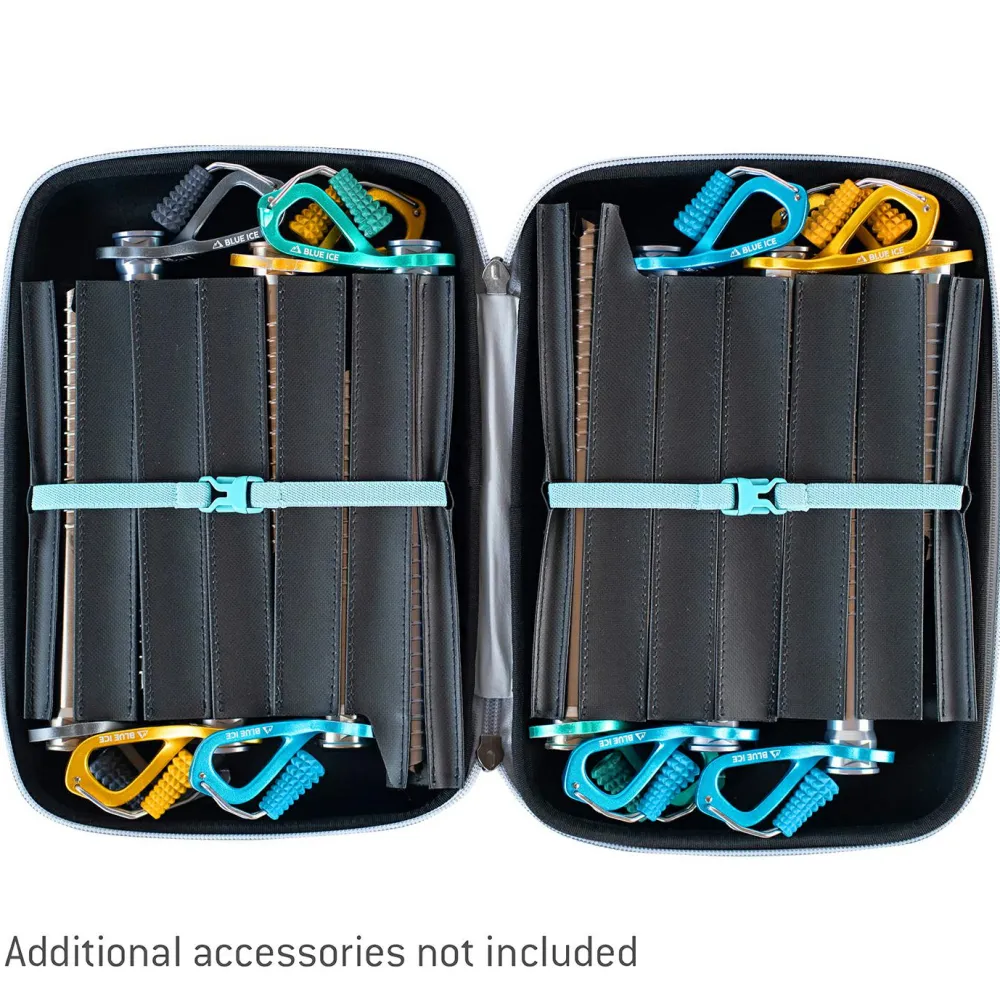 Der Blue Ice Screw Keeper ist ein leichtes und robustes Eisschrauben-Etui, das Eisschrauben maximalen Schutz bietet. Das thermogeformte Etui bietet insgesamt 12 Fächer zur Aufbewahrung von Eisschrauben, zwei Fächer für zwei Eisschrauben mit 22 cm Länge und 10 Fächer für Schrauben mit bis zu 19 cm Länge. So kann ein vollständiges Set Eisschrauben leicht vor dem Rest der Ausrüstung geschützt werden und ist stets griffbereit. Die Eisschraubenhalter lassen sich per Klettverschluss aus dem Screw Keeper entfernen und können separat verwendet werden.