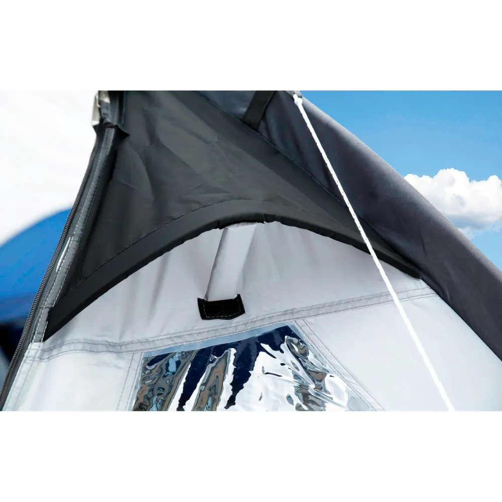 Das Zelt besitzt einen großen Fronteingang und zwei gegenüberliegende Seiteneingänge, die einen bequemen Zugang von allen Seiten ermöglichen. Mithilfe von separat erhältlichen Aufstellstangen können die Eingangstüren auch als praktisches Sonnendach verwendet werden, um ein schattiges Plätzchen im Freien zu schaffen. Die großen Klarsichtfenster an der Front bieten einen guten Blick nach draußen und sorgen gleichzeitig für eine helle und freundliche Raumatmosphäre. Darüber hinaus ist das Zelt mit mehreren Ventilationsöffnungen ausgestattet, um ein angenehmes Raumklima zu gewährleisten. Der mitgelieferte Packsack erleichtert den Transport und rundet das stimmige Gesamtpaket ab. Mit dem Entrada von Brunner steht dem nächsten Ausflug mit dem Campingbus nichts mehr im Weg!
