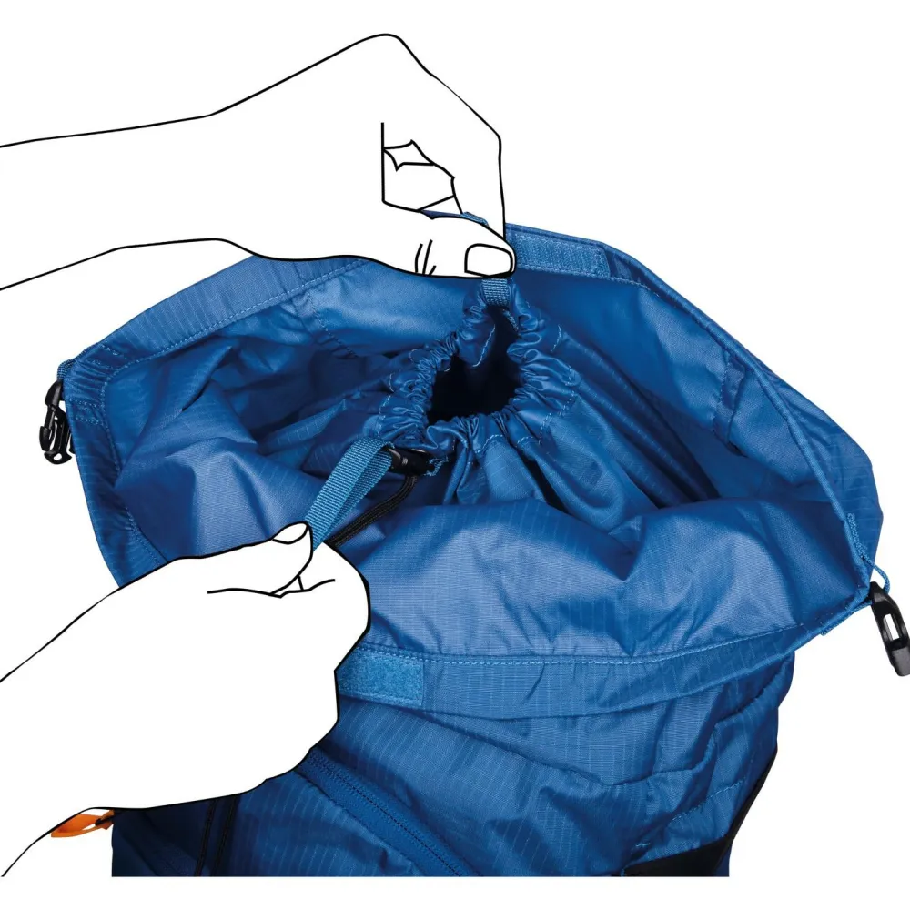 Die Tasche für Schaufel und Sonde ist sofort erkennbar und im Bedarfsfall leicht zugänglich, ebenso wie die Steigeisenhalterung mit seitlicher Öffnung, auf die man ohne Abnehmen des Rucksacks zugreifen kann. Hinzu kommt die elastische Vordertasche zum Aufbewahren von nassen Gegenständen wie Fellen oder Kleidung, die sich besonders beim Abstieg als praktisch erweist!