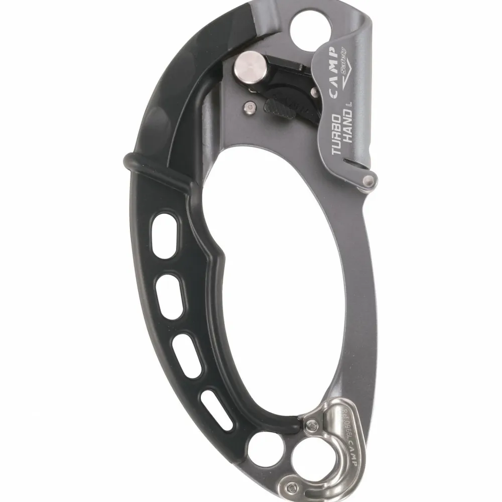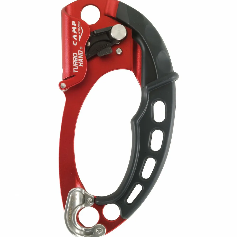 Die Turbohand Pro von Camp macht ihrem Namen alle Ehre und sorgt dafür, dass die vertikalen Meter einfach und schnell von der Hand gehen. Der angenehme Griff liegt bequem in der Hand und sorgt auch bei vielen Stunden Einsatz für Komfort im Handling. Das Seilführenzubehör im unteren Bereich der Steigklemme sorgt für eine perfekte Ausrichtung des Seils innerhalb des Griffs. Der gezahnte Nocken aus Edelstahl ist sehr robust und klemmt sich im Seil sicher fest, ohne es zu beschädigen. In den Befestigungsöffnungen finden Karabiner einen sicheren Verankerungsort. Die Turbohand Pro ist zusätzlich auch als Umlenkrolle einsetzbar. Hierbei darf sie jedoch nur mit maximal 50 kg belastet werden.