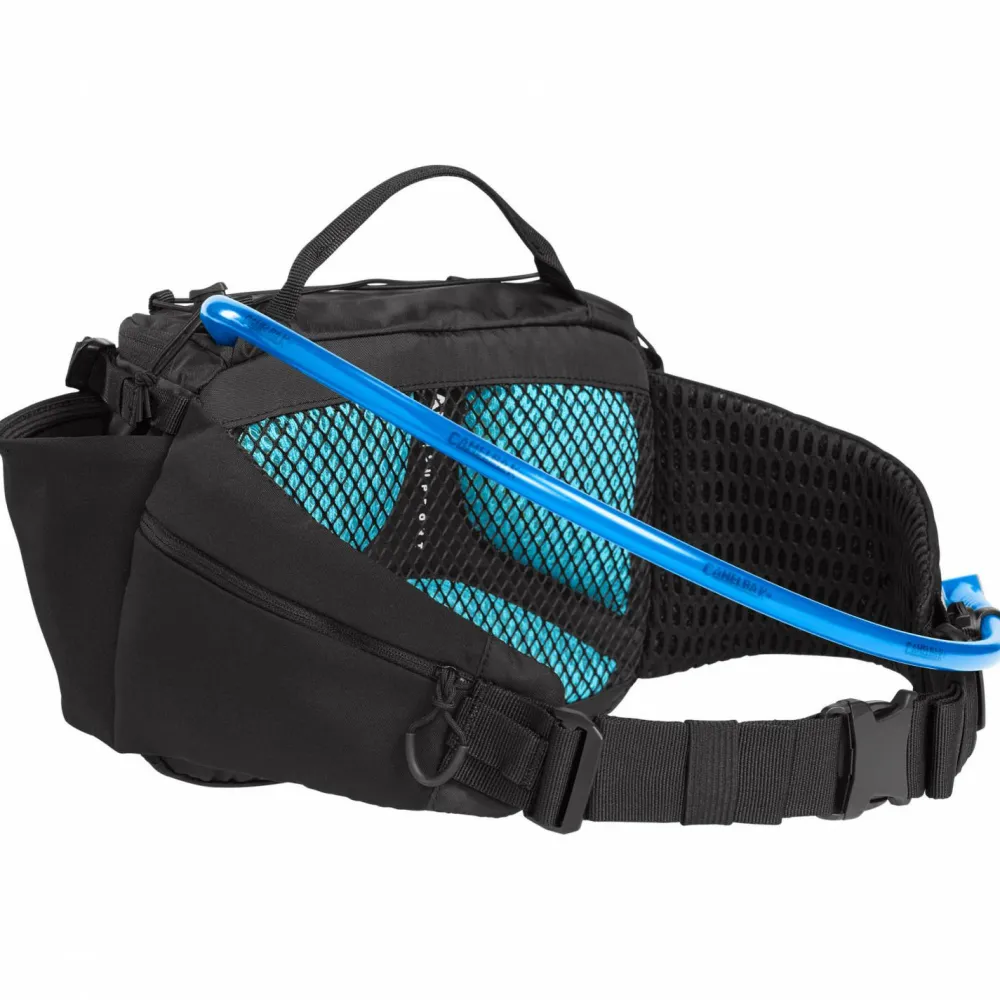 Die Gürteltasche M.U.L.E. 5 von Camelbak ist speziell für Mountainbiker entwickelt. Sie besteht aus einem robusten und reißfesten Material und dient in erster Linie dem Transport von Flüssigkeit und kleineren Ausrüstungsgegenständen. Zwei Flaschenhalter und ein maximales Packvolumen von vier Litern machen die Tasche zu einer praktischen Begleiterin auf allen Trails. Der Hüftgurt lässt sich leicht in die optimale Passform bringen. Er passt zu Hüftumfängen von 77 cm bis 132 cm. Reflektierende Elemente erhöhen zudem die Sichtbarkeit im Dunkeln.