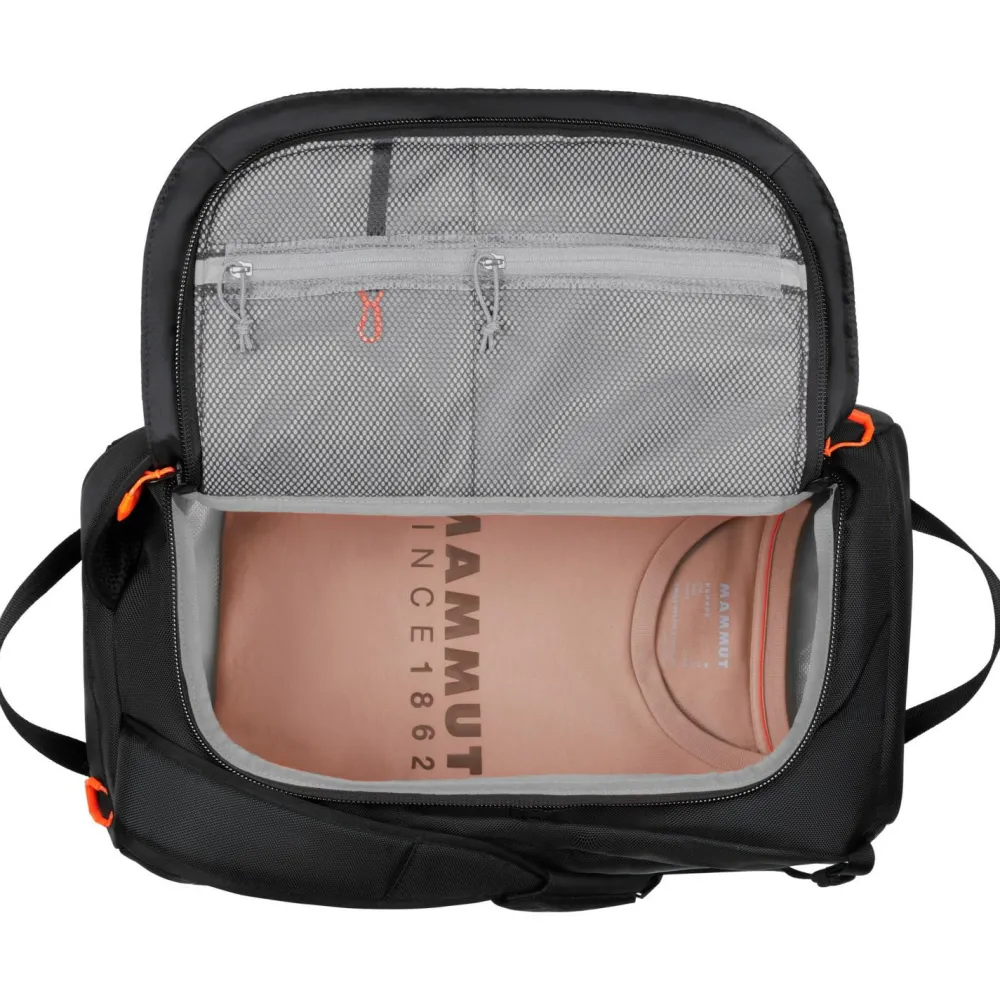 Mammut stattet die Reisetasche mit einem großen Deckel und drei praktischen Innenfächern aus. Tragegriffe und verstellbare Schultergurt ergänzen die Cargon Reisetasche von Mammut. So lässt sie sich beim Transport auch auf dem Rücken tragen. Ob beim Sport, oder auf Expedition – ob Kletterausrüstung oder Skistiefel – in die Mammut Reisetasche passt das gesamte Sportequipment.