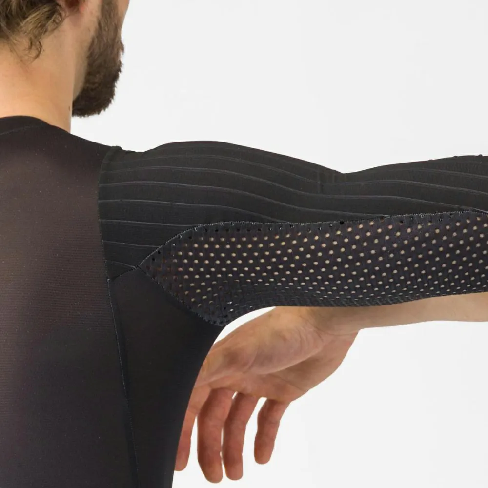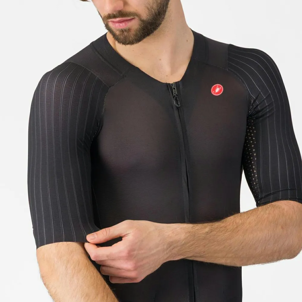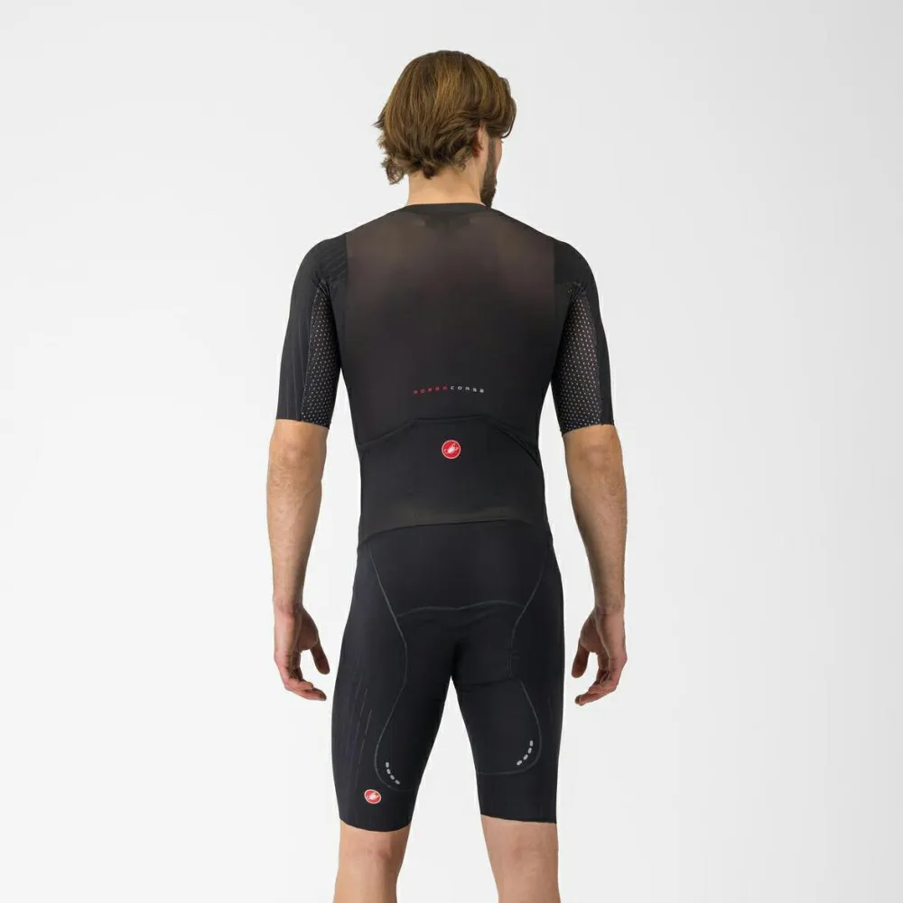 Erlebe mit dem Sanremo S Speed Suit von Castelli eine harmonische Verbindung aus italienischem Design sowie Funktionalität und Stil! Castelli ist bekannt dafür, hochwertige Radsportbekleidung zu kreieren, die durch fortschrittliche Materialien besticht. Der 3/4-lange Front-Reißverschluss macht das An- und Ausziehen zum Kinderspiel und sorgt gleichzeitig unterwegs für beste Belüftung. Die kurzen Beine des Anzugs verleihen Dir einen windschnittigen Look – optimal für schnelle Etappen! Drei Rückentaschen bieten ausreichend Stauraum für alles Notwendige während Deiner Fahrt. Das Aero-optimized Forza2 Stretch Material passt sich perfekt an Deinen Körper an und steigert Deine aerodynamische Effizienz – ein unverzichtbares Feature für ambitionierte Fahrer.