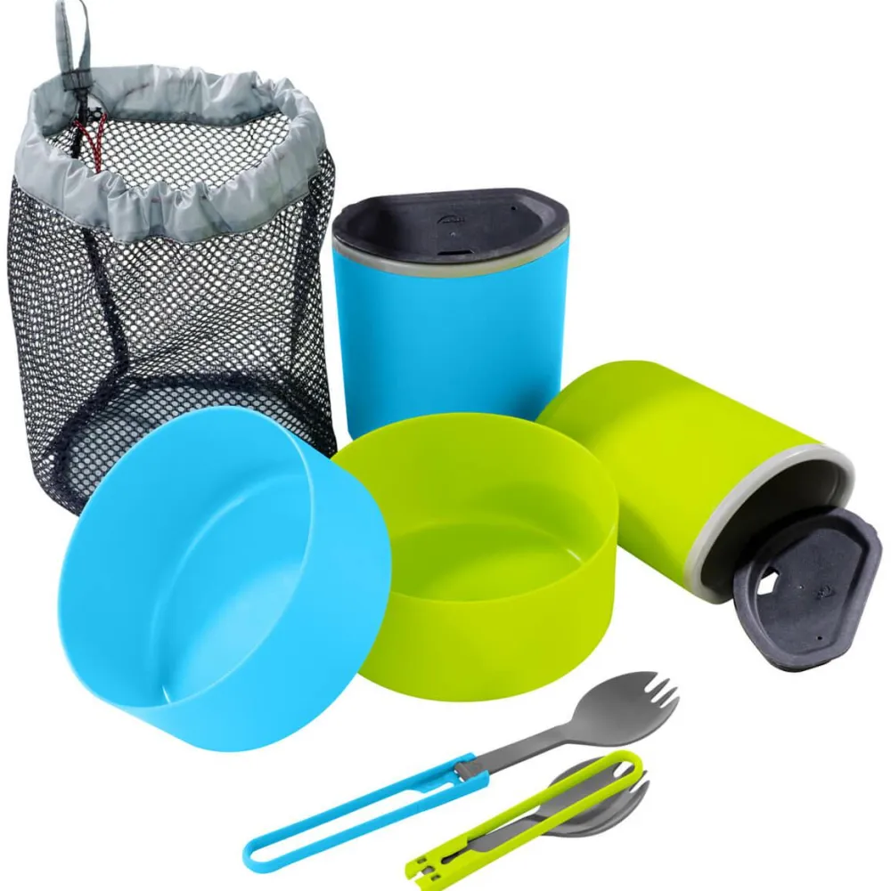 Alles dabei, was man braucht, im 2 Person Mess Kit Campinggeschirr von MSR. Es ist ideal zum Campen oder für Zelttouren, bei denen man auch einen Kocher angewiesen ist. Es kommt mit zwei Schüsseln fürs Essen, zwei isolierenden Trinkbechern und zwei ausklappbaren Löffeln mit kleinen Gabelspitzen. Praktischerweise kann es einfach im mitgelieferten Packsack untergebracht und im Rucksack verstaut werden. Das 2 Person Mess Kit Campinggeschirr sollte im Tourengepäck nicht fehlen.