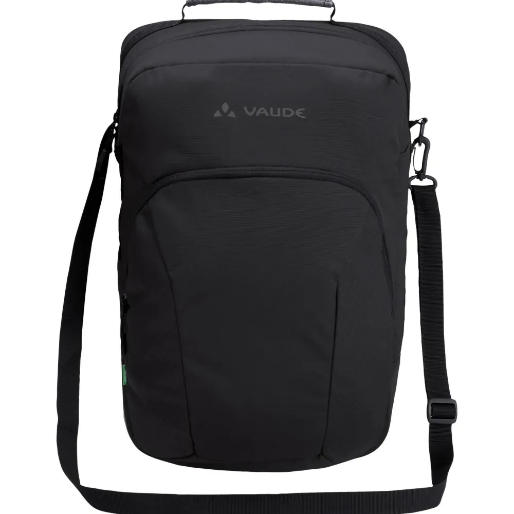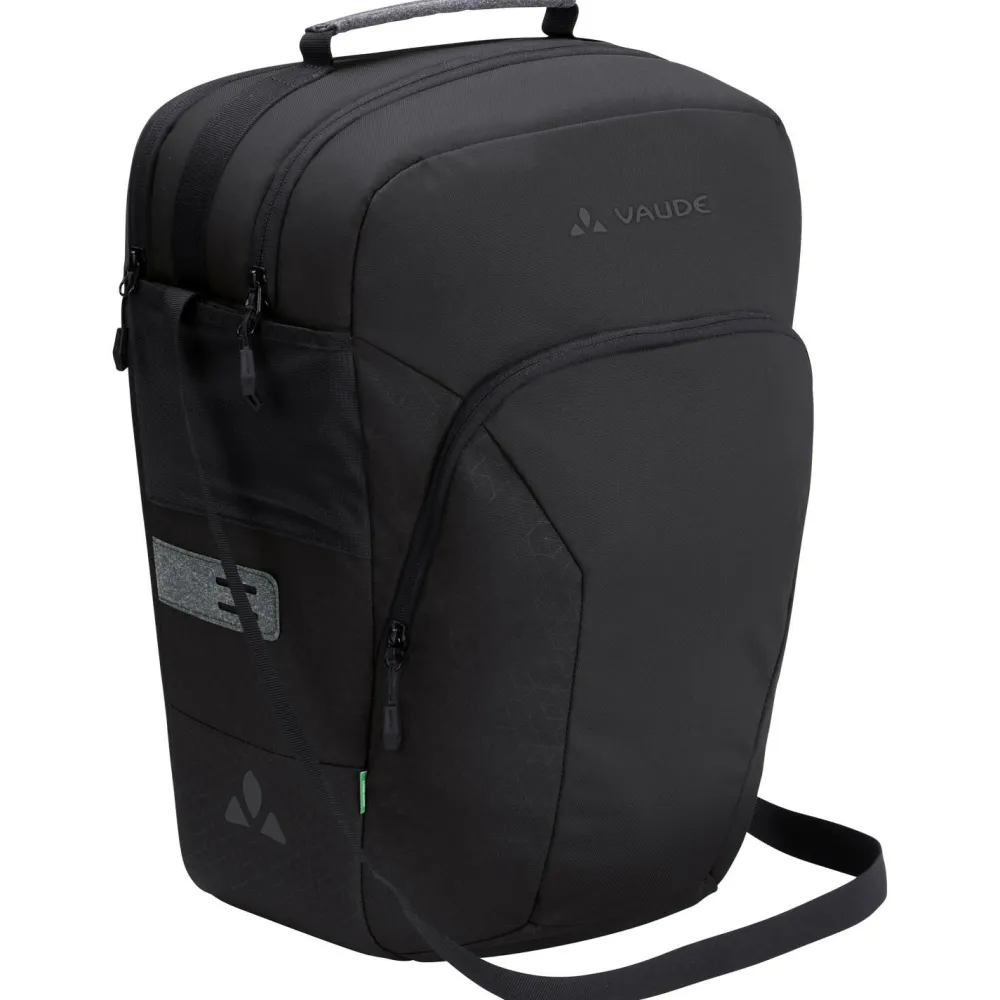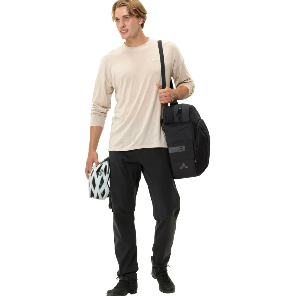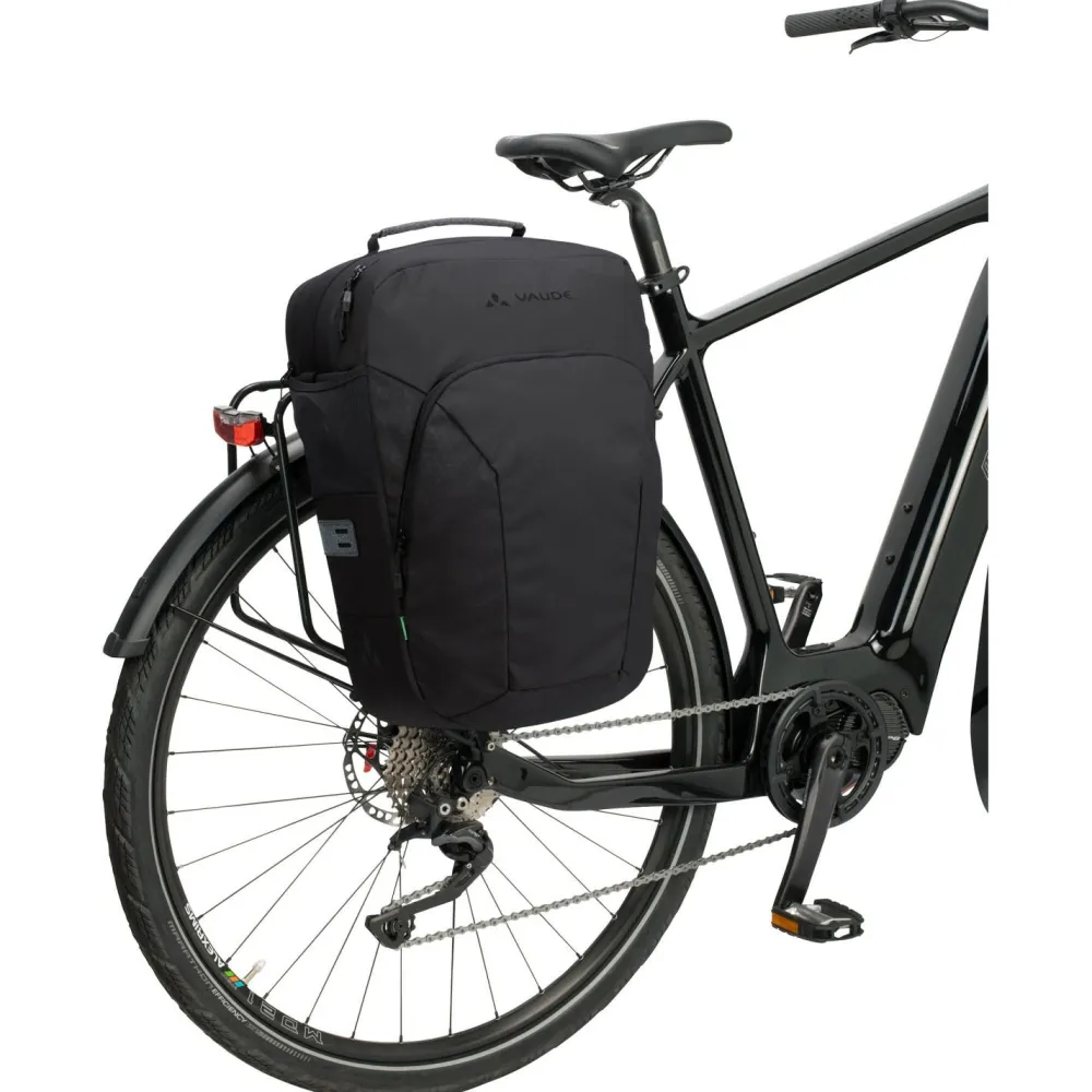 Die Eback Single Gepäckträgertasche von Vaude bietet in ihrem separaten Notebookfach Platz für ein 15,6“ großes Notebook. Im geräumigen Hauptfach lässt sich außerdem ein zweiter E-Bike Akku (bis zu 40 cm Länge) verstauen. Ein extra Außenfach mit Reißverschluss und interner Organizeraufteilung ergänzt das funktionelle Design. Die Tasche verfügt über Schulterträger und Tragegriff. Per QMR 2.0 Befestigungssystem wird die Fahrradtasche bequem am Gepäckträger eingehängt (Durchmesser 8-16 mm). Zudem ist das QMR abschließbar. Bei 22 Liter Volumen passt das mobile Büro bequem in die Packtasche.