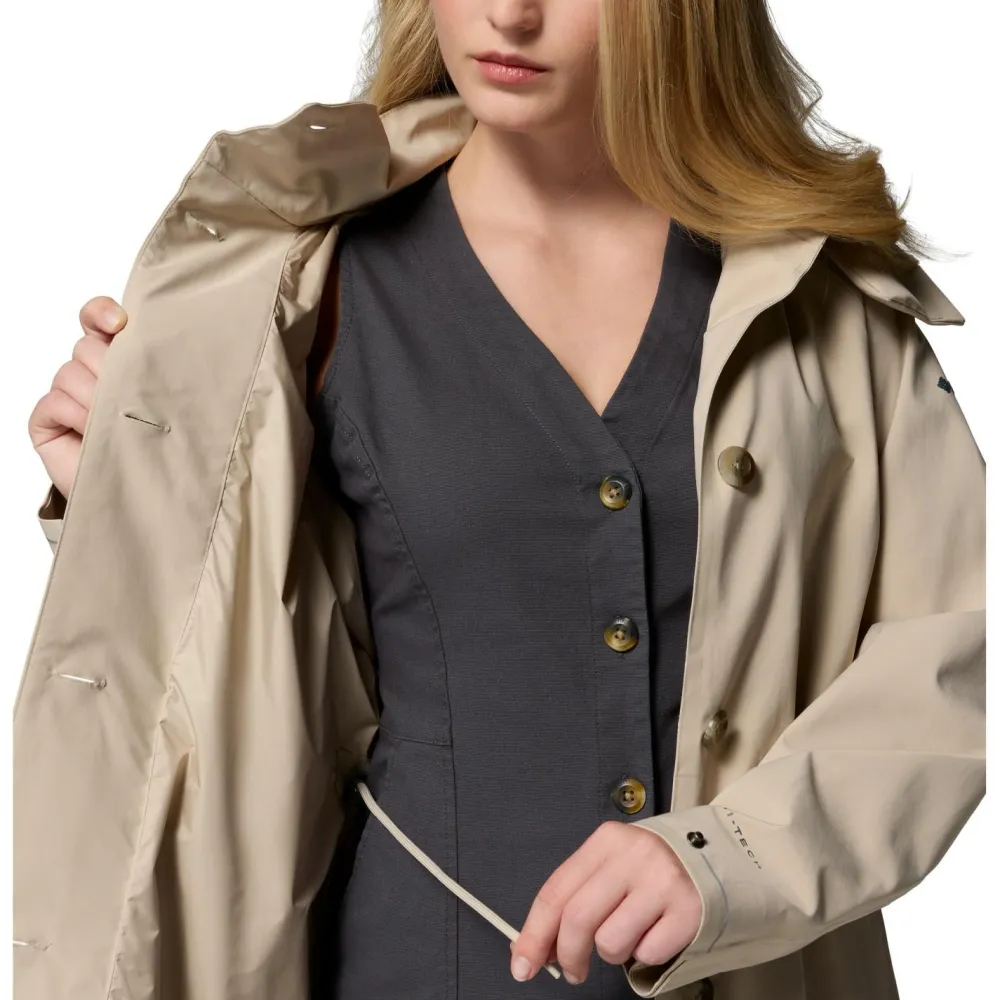 Die Women’s Amazetrench Rain Jacket von Columbia bietet verlässlich wasserdichte Materialien, die verhindern, dass es im Inneren des Mantels unangenehm nass wird. Zudem kann Feuchtigkeit, die beim Schwitzen entsteht, schnell nach draußen gelangen. Darum kümmern sich die atmungsaktiven Eigenschaften der Jacke. Wenn es stürmt und regnet, kann der Kopfbereich mit einer Kapuze vor dem Wetter geschützt werden. Damit sie perfekt sitzt, ist ein Kordelzug integriert, der die Feinjustierung ermöglicht.