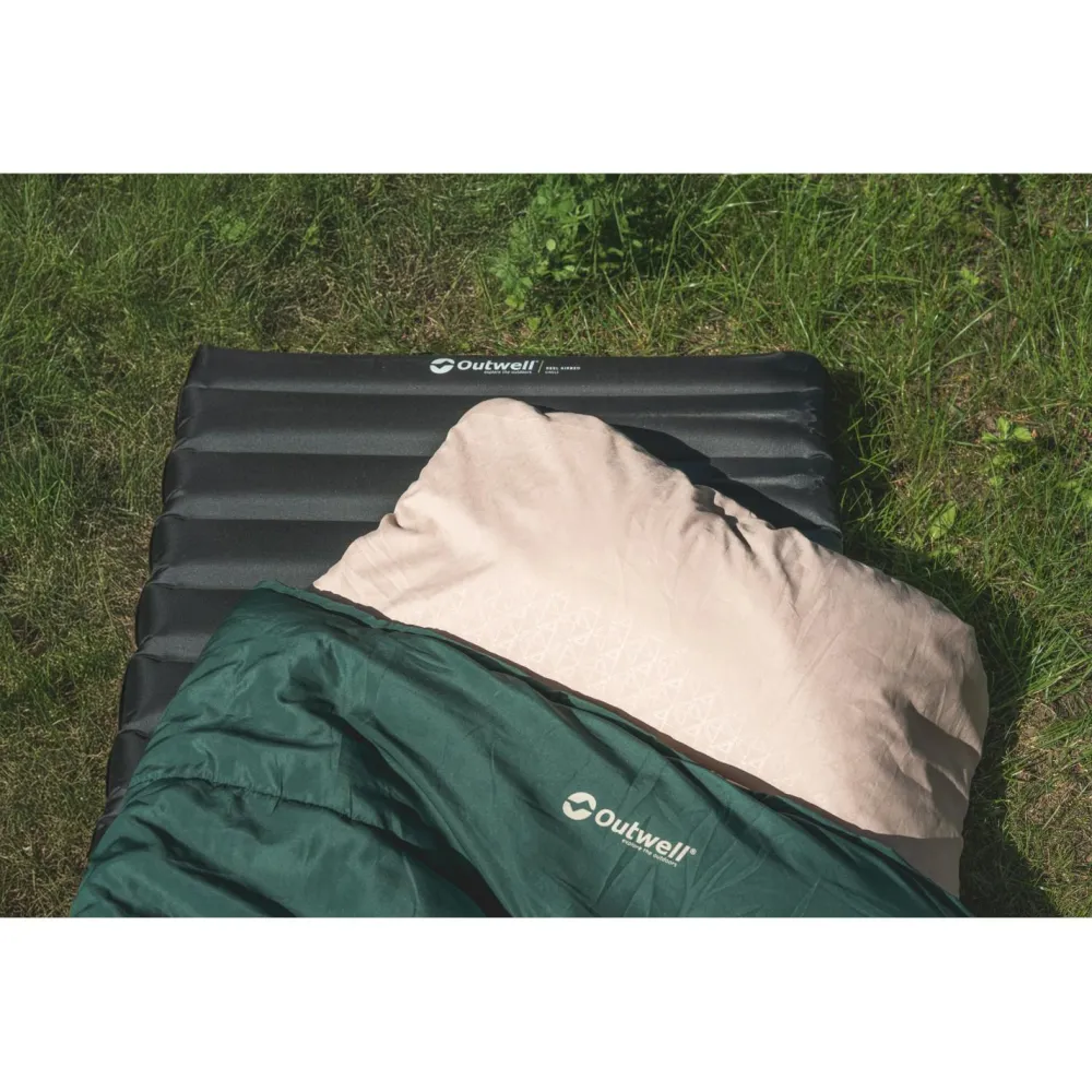 Ein integriertes Kissen erhöht den Liegekomfort, ohne dass Du zusätzlich etwas einpacken musst. Der L-förmige Reißverschluss lässt sich leicht bedienen und erlaubt es, den Schlafsack vollständig zu einer Decke zu öffnen. Eine durchgehende Abdeckleiste reduziert Wärmeverlust und Befestigungsschlaufen im Fußbereich fixieren ein optionales Inlett. Für gemeinsam Reisende lassen sich zwei Modelle miteinander koppeln. Im Kompressionssack wird der Schlafsack kompakt verstaut und ist schnell wieder zur Hand.