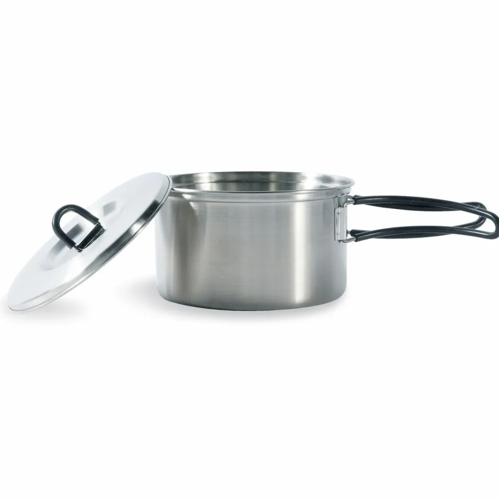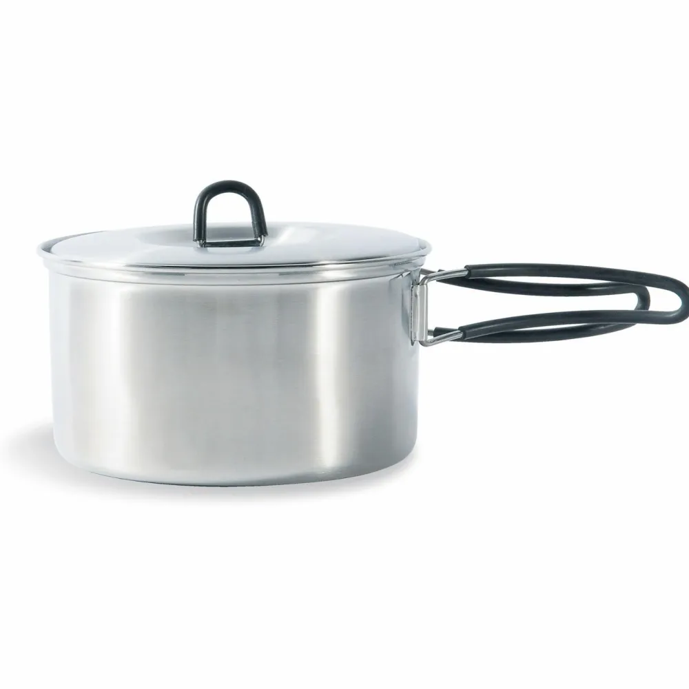 Outdoorköche und Köchinnen aufgepasst: das Cookset Regular von Tatonka bereichert die Campingküche! Das fünfteilige Edelstahl Kochset besteht aus einer Pfanne, einem 0,9 Liter Topf mit Deckel und einem 1,3 Liter Topf mit Deckel. Beide Töpfe und die Pfanne sind mit praktischen Klappgriffen versehen. Ineinander gepackt passt das Set platzsparend in den mitgelieferten Packbeutel.