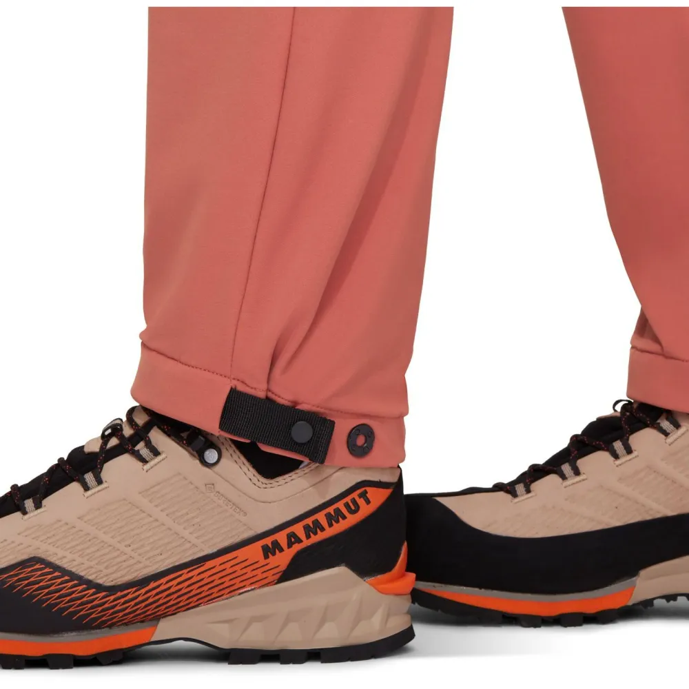 Die hochwertige Hybrid-Softshell-Hose Women’s Courmayeur SO Pants hat Mammut für ambitionierte Bergsportlerinnen entwickelt. Dank ihres hoch atmungsaktiven, elastischen und windabweisenden Schoeller-Softshell-Materials ist sie vielseitig einsetzbar, angenehm zu tragen und gibt unheimlich viel Bewegungsfreiheit. Das robustere Double-Weave-Material im Gesäß-, Knie- und unteren Beinbereich ist besonders abriebfest und scheut auch den Kontakt mit Fels nicht. Die Taillenbundverstellung lässt sich von außen bedienen und sorgt für einen perfekten Sitz. Ein asymmetrisch geformter Saum und ein verstaubarer Befestigungshaken garantieren eine optimale Passform der Hose über den Bergschuhen. Die Beinenden lassen sich zusätzlich durch Druckknöpfe in der Weite verstellen.
