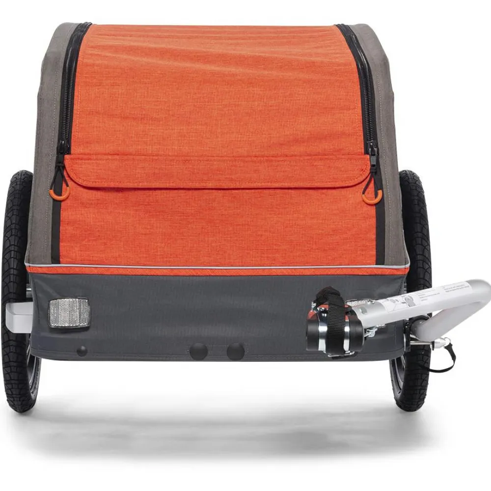 Für mehr Sicherheit sind stabile Stoßfänger vor den Reifen angebracht, welche das Verkanten oder Blockieren verhindern. Zudem dienen sie als praktischer Fixpunkt für das Fahrradschloss. Die Deichsel wird mit der beiliegenden Kupplung am Fahrrad befestigt und ist abschließbar. Das Gepäck oder die Einkäufe können mit dem Verdeck vor Regen und Dreck geschützt werden. Zudem ist der gesamte Bezug wasserabweisend.