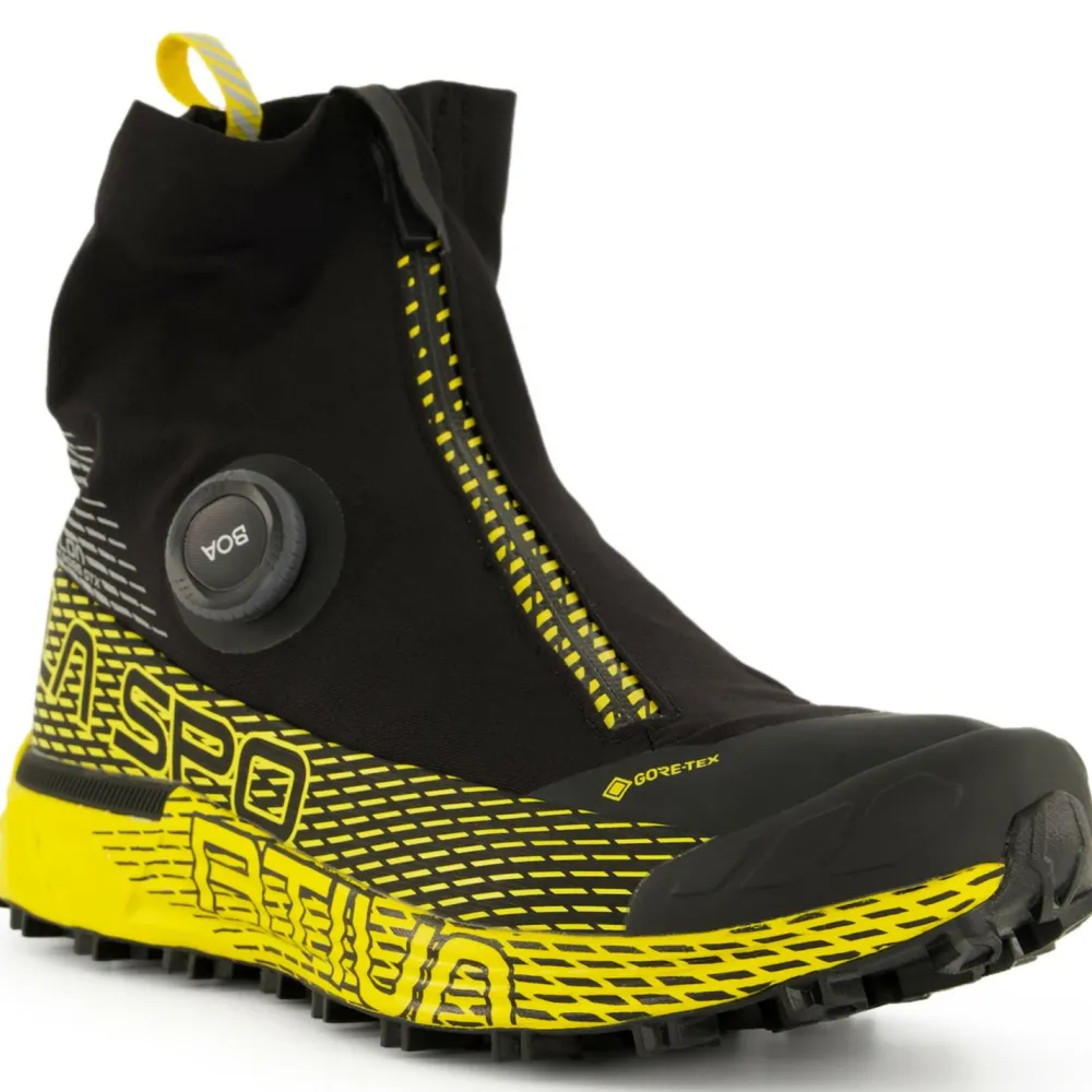 Der Cyklon Cross GTX von La Sportiva ist ein technischer Mountain Running-Schuh aus GORE-TEX mit integrierter Gamasche. Der hohe Schaft verhindert das Eindringen von Schnee und Dreck. Dank der integrierten Membran sind die Schuhe überdies wasser- und winddicht. Gleichzeitig sorgt die hohe Atmungsaktivität für einen schnellen Abtransport von Feuchtigkeit aus dem Inneren. Dank des BOA Fit Schnürsystems und dem Frontreißverschluss lassen sich die Schuhe super schnell an- und ausziehen.