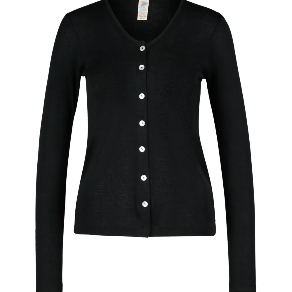 Hochwertig verarbeitet, weich und atmungsaktiv: der Engel Damen Cardigan Feinripp! Der Cardigan aus weichem, geripptem Material sorgt für ein rundum kratzfreies, super weiches Tragegefühl. Der Materialmix aus Schurwolle und Seide wirkt temperaturregulierend und kann sogar in der Maschine gewaschen werden! Das schöne, klassische und feminin-taillierte Design sorgt dafür, dass der Cardigan prima mit jedem Outfit kombinierbar ist.