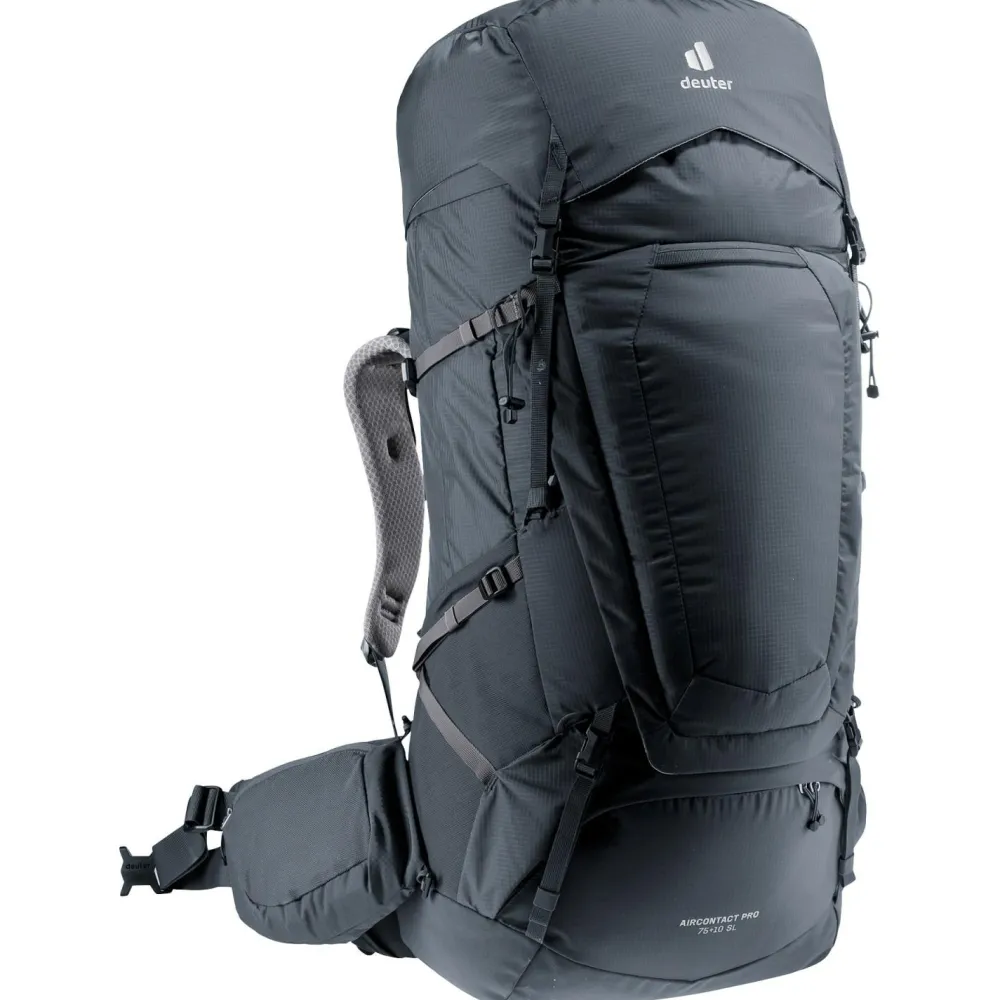 Verlässlicher Partner in der Wildnis: der Aircontact Pro 85+10 l Trekkingrucksack von Deuter! Dieser erstklassige Trekkingspezialist ist für freiheitsliebenden Abenteurerinnen, die autark abseits der großen Trekkingpfade die Natur erkunden wollen und sich dabei voll und ganz auf ihre Ausrüstung verlassen müssen. Durch das Aircontact-Rückensystem mit austauschbaren und konfigurierbaren VariFlex-Hüftflossen sowie die ActiveFit-Schulterträger passt er sich modular und punktgenau an die Anatomie der Trägerin an. Die Rückenlänge ist mit dem VariSlide-System schnell und sauber eingestellt. Die Lastübertragung wird durch den stabilen Aluminium-Y-Rahmen und den Lumbal-Pad mit großflächigem Air Spacer Mesh so effizient und angenehm wie möglich gestaltet.