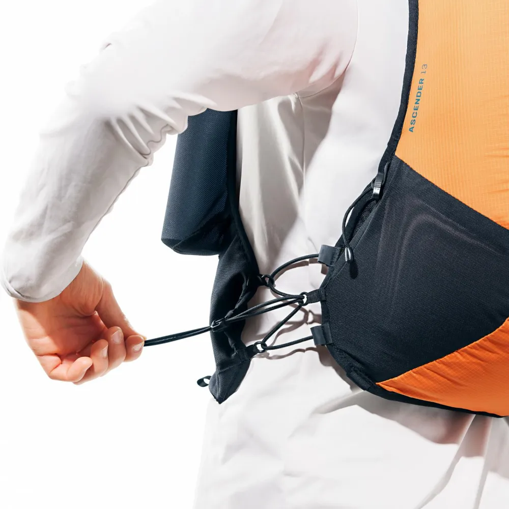 Das Rucksackgewebe ist wunderbar reiß- und abriebfest. Der Innenraum packt bis zu sieben Liter ein und wird durch ein Wertsachenfach und ein Stretchfach im Innenbereich sowie zwei elastischen Seitentaschen und einer Tasche am Schulterträger fürs GPS oder Smartphone ergänzt. Damit Ihr beim Zugriff auf die Stockhalterung nicht aus dem Tritt kommt, ist diese leicht zugänglich vorne am Schulterträger platziert. Das softe Rückenteil passt sich wunderbar der Bewegung an. Zur Gewichtsersparnis könnt Ihr übrigens den Rückenschaum bei Bedarf entfernen, was den Ascender 7 nochmals um rund 10% leichter macht. Top!