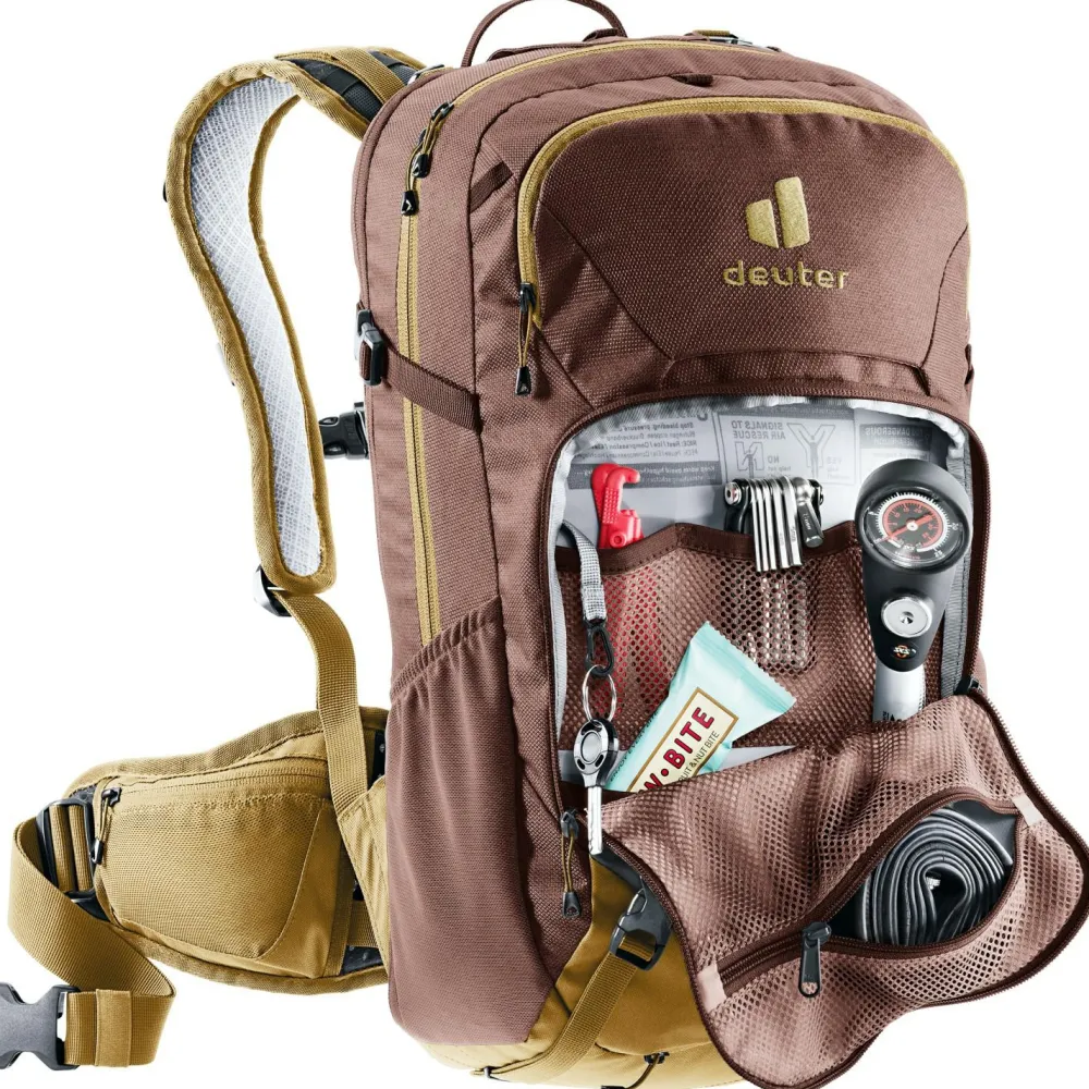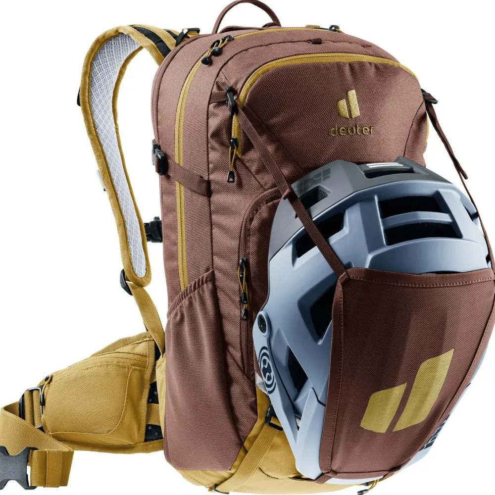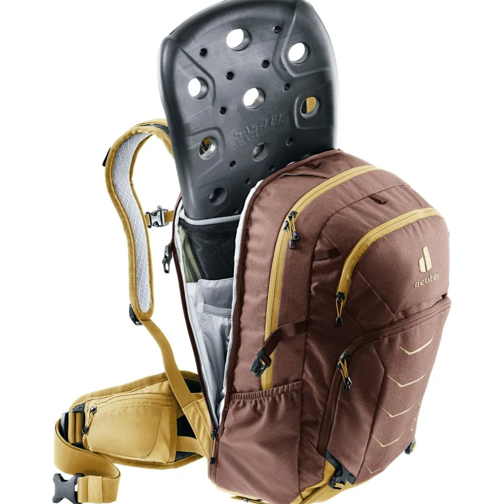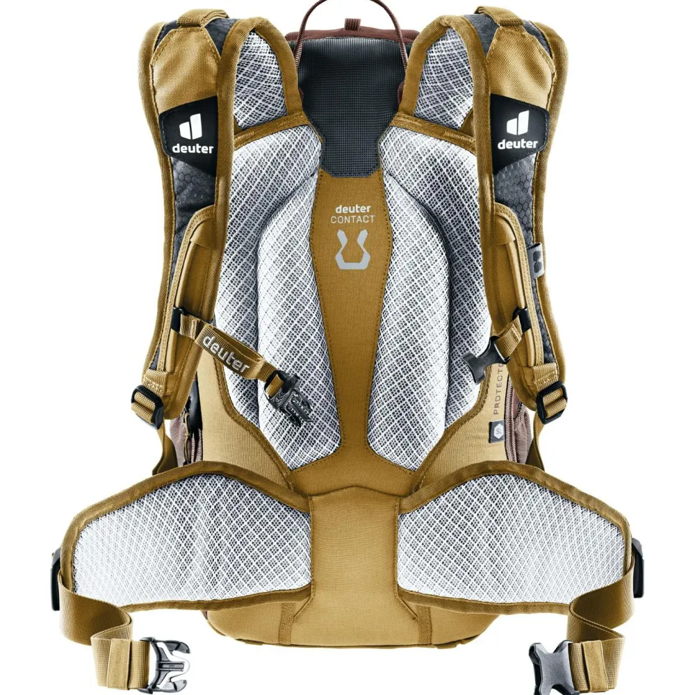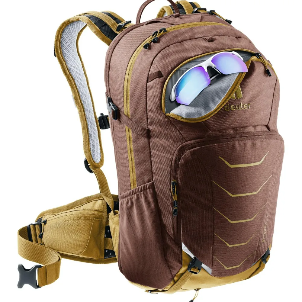 Ruppige Trails und anspruchsvolle Bike-Abenteuer sind das Zuhause des Women’s Attack 18 SL Bike-Rucksacks von deuter. Die vielen Taschen und Fächer ermöglichen ein sicheres und geordnetes Aufbewahren von Kleinigkeiten. Im vorderen Organizer-Fach lassen sich Kleinigkeiten genau am vorgesehenen Platz transportieren und sind mit einem Griff erreichbar. Um das Bike bei schwierigen Bergauf-Passagen leichter tragen zu können, lässt sich der Rahmen des Fahrrads auf dem verstärkten und rutschfesten Bereich am oberen Rücken des Attack auflegen. So müssen die Arme weniger Gewicht stemmen und die Passage kann mühelos überwunden werden. Im Falle eines Sturzes ist der Attack mit einem robusten Protektor für den Rücken ausgestattet. Das Material gelangt nach einer Verformung schnell wieder in den Ursprungszustand zurück. Um bei schweißtreibenden Bedingungen nicht zum Trinken anhalten zu müssen, ist der Rucksack mit einem Trinksystem kompatibel. Der Schlauch lässt sich durch ein vorgefertigtes Loch über die Schulterträger nach vorne führen.