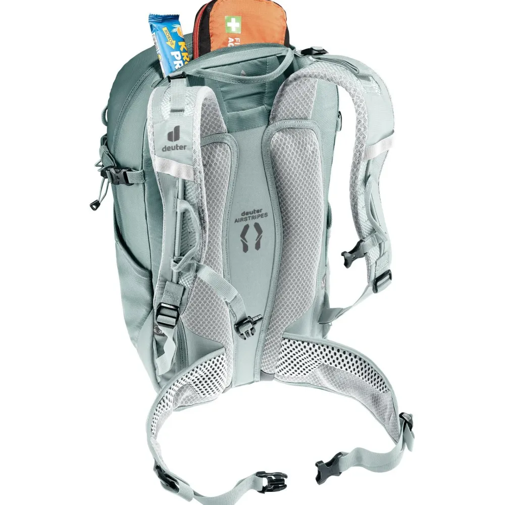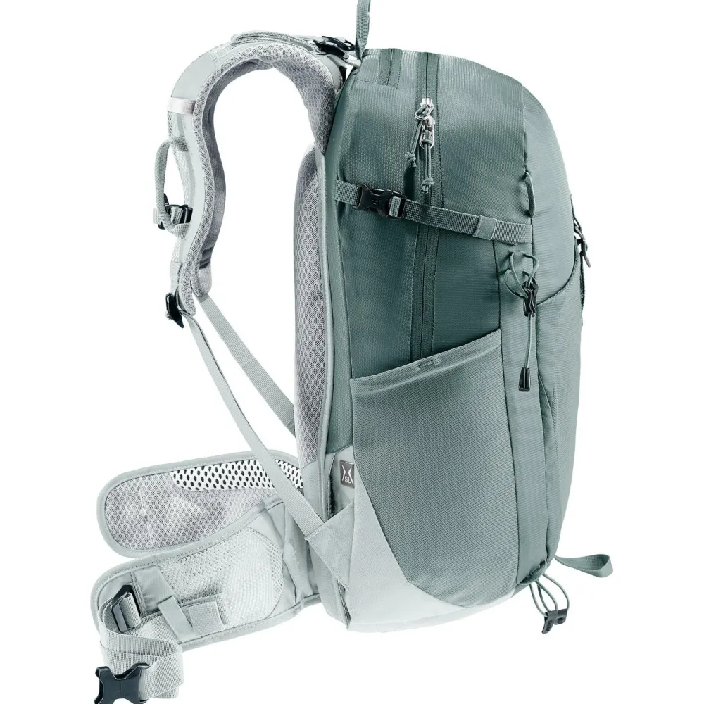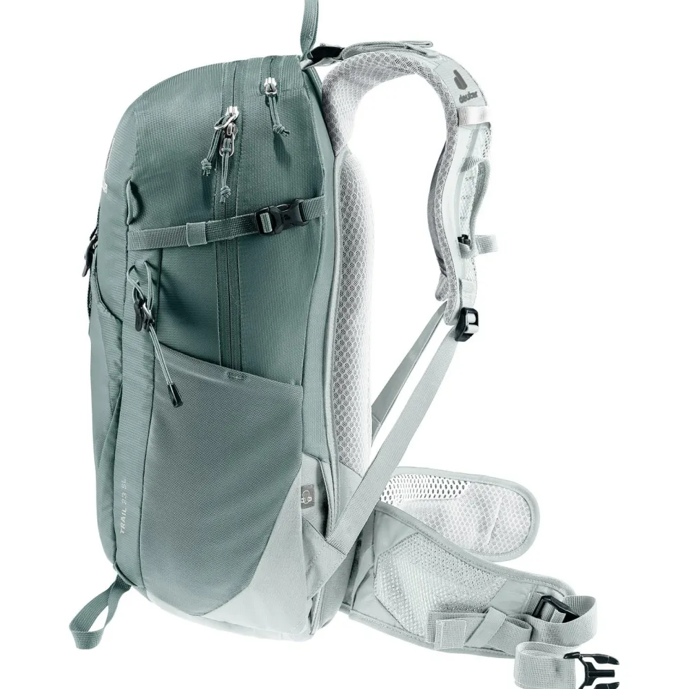 Durch das anatomisch geformte SL Tragesystem wird Deine nächste Bergtour mit dem Women’s Trail 23 SL von deuter zu einem vollen Erfolg. Der leichte Wanderrucksack wird mit recycelten Materialien hergestellt und eignet sich ideal für den Bergsport. Die ergonomischen Schulterträger sind beweglich gelagert und sorgen in Kombination mit dem robusten U-Rahmen im Rückenbereich beim Wandern für eine optimale Lastenverteilung. Dank einer flexiblen Halterung kannst Du Pickel oder Wanderstöcke bequem außen am Tourenrucksack anbringen.