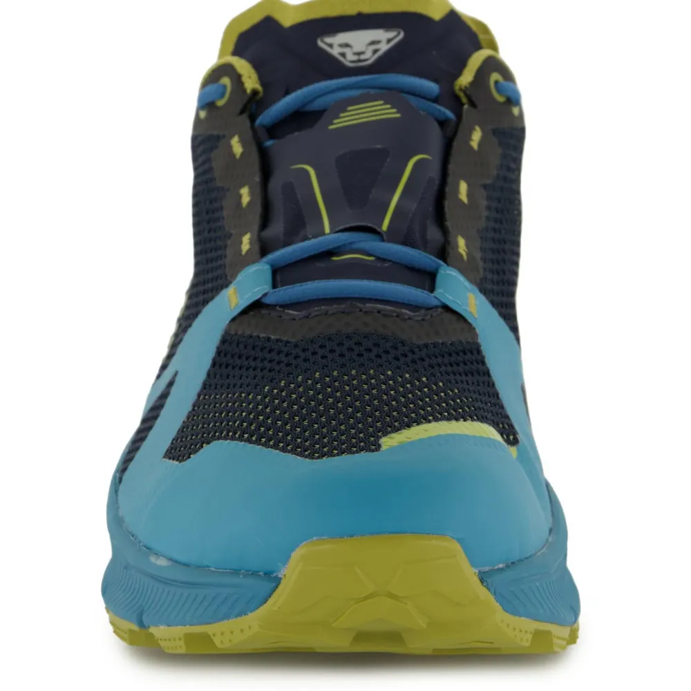 Unterstützt werden Läufer außerdem durch die Ultra Zwischensohle und das dämpfende Fußbett. Im Fersenbereich und an den Fußspitzen sind die Trailrunningschuhe extra verstärkt, wodurch gute Stabilität und Robustheit im Gelände gewährleistet werden. Über der dünn gepolsterten Zunge sorgt die flache Schnürung für optimale Anpassungsmöglichkeiten. Das Schnürsystem ist abgedeckt, damit sich die Schnürsenkel beim Laufen im Gelände nicht verhaken oder lösen können. Die Sprengung beträgt beim leichten Ultra 100 von Dynafit 6 mm und bietet eine gute Mischung aus Komfort und Präzision beim Trailrunning.