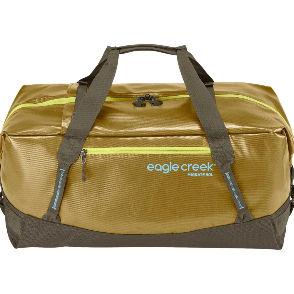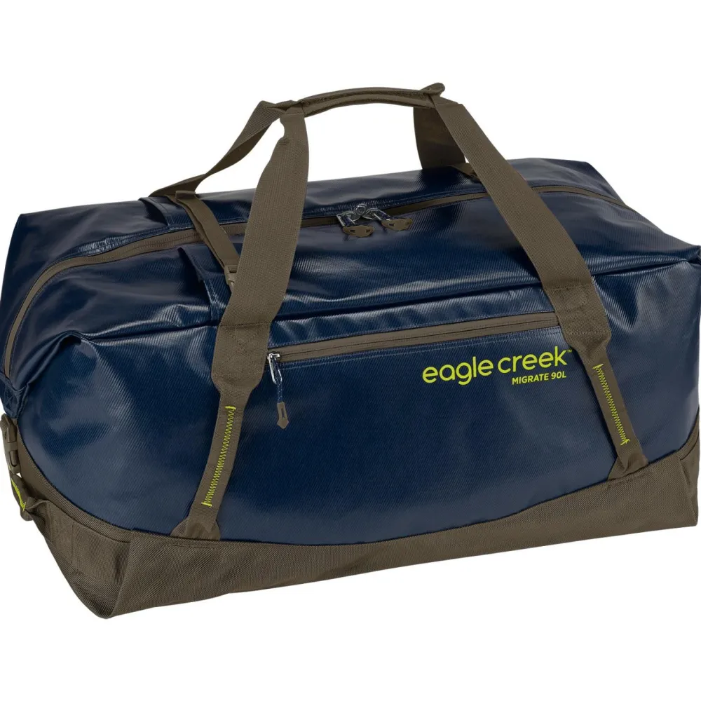 Die Migrate Duffel 90 L von eagle creek, ist eine umweltfreundliche, robuste und gut durchdachte Reisetasche. Sie ist aus 100 % recyceltem Material hergestellt. Das Hauptfach ist durch einen großen Reisverschluss zugänglich, welcher abschließbar ist und durch eine große Schlaufe auch mit Handschuhen bedienbar ist. Zusätzlicher Stauraum kann man durch die Lösbaren Steckschließen gewinnen. Die Rucksackgurte lassen sich einfach verstauen. Durch spezielle Techniken ist die Tasche wasserbeständig, abriebfest und Staubresistent. Zum Aufbewahren kannst Du die Migrate Duffel 90 L klein zusammenfalten.