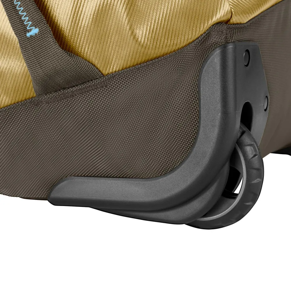 Durch spezielle TPU – Beschichtung ist die Tasche maximal wasserbeständig und abriebfest. Sogenannte Windschutzlappen verhindern das Eindringen von Staub. Durch Outdoortaugliche Rader, welche in sehr robusten Radkästen befestigt sind, wird Dein Rücken auch in rauerem Gelände geschont. Zum Aufbewahren kannst Du die Migrate Wheeled Duffel 110 L klein zusammenfalten.