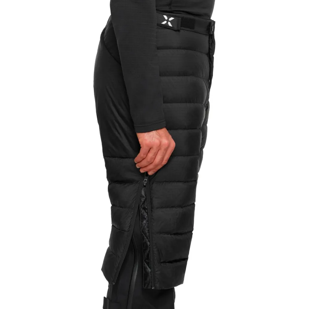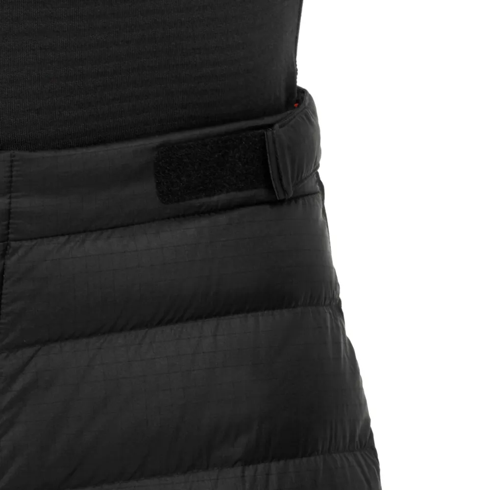 Mit einem durchgehenden Reißverschluss an den Beinen kann sie auch beim Tragen von Skischuhen direkt übergezogen werden und spendet verlässlich Wärme. Hierfür ist die hochwertige Füllung der Hose verantwortlich. Sie kombiniert die Vorteile von Daunen und Kunstfasern und spendet so auch bei Feuchtigkeit Wärme. Am Bund kann die Daunenhose mithilfe von Klettverschlüssen in der Passform verstellt werden.