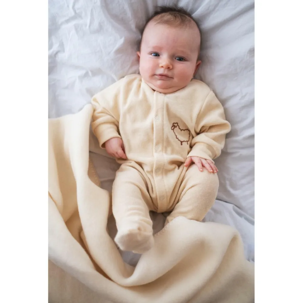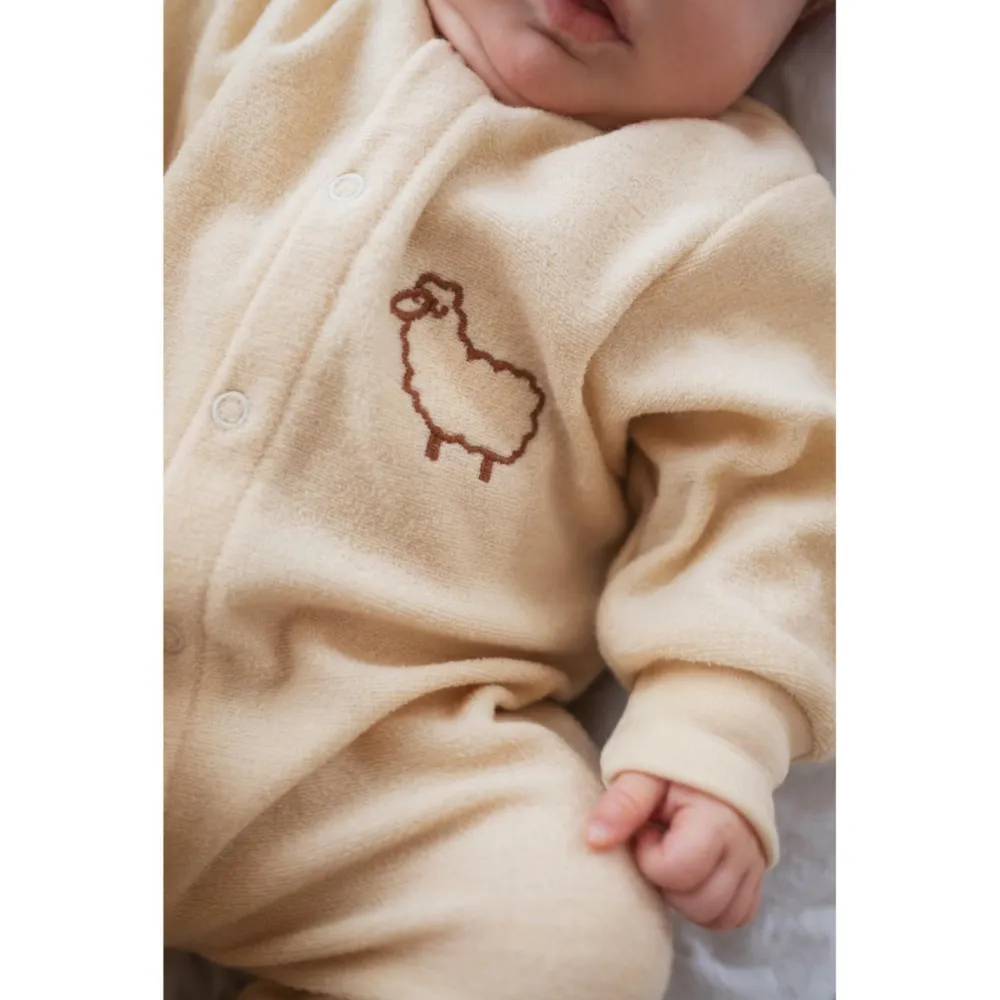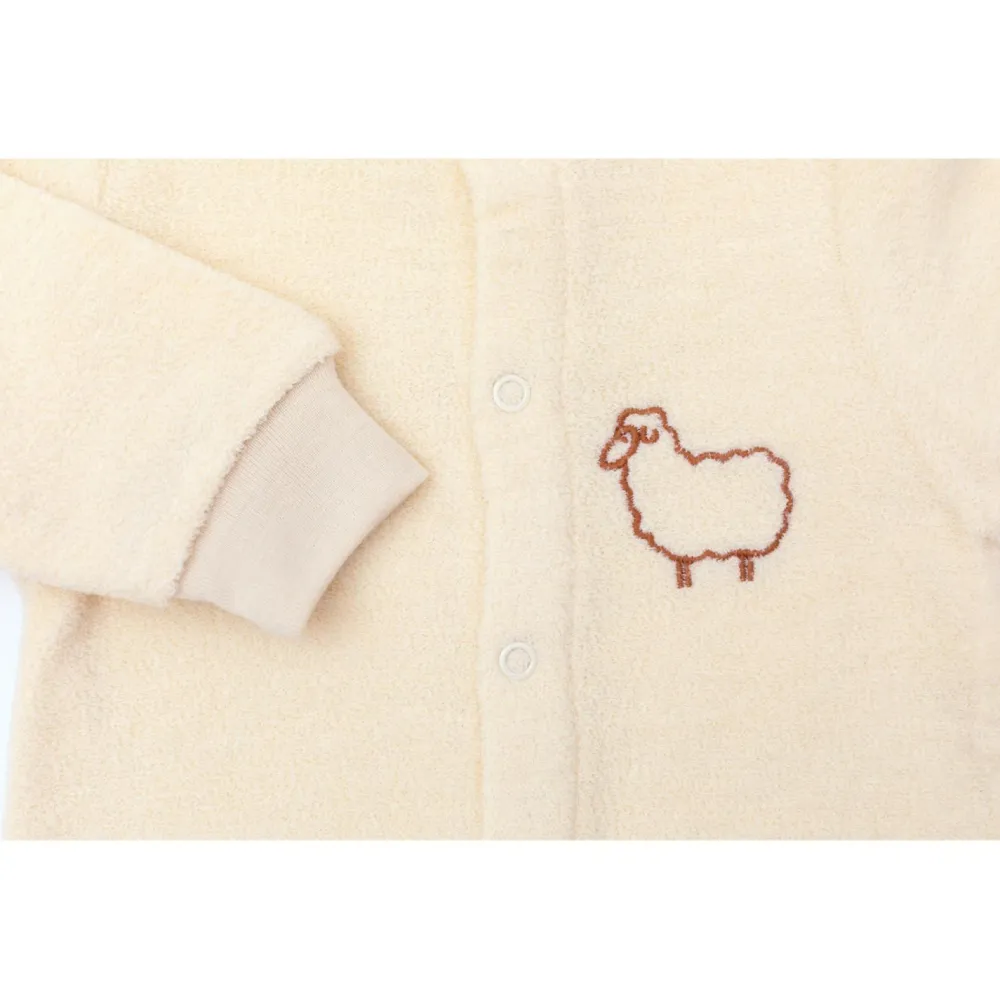 Die durchgehende Druckknopfleiste macht das An- und Ausziehen einfach, während die glatte Innenseite sanft zur Haut ist. Mit Füßen für extra Wärme und einem süßen Schäfchenmotiv auf der Brust wird der Schlafanzug schnell zum Lieblingsstück.