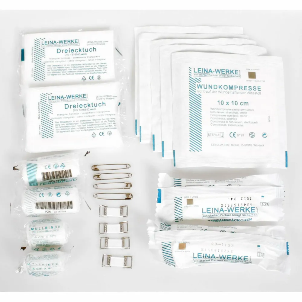 Im Set enthalten: Verbandpäckchen, Mullbinden, Kompressen, Dreieckstücher, Rettungsdecke silber/silber, Feuchttücher, Einmalhandschuhe, Heftpflasterspule, Wundschnellverband, Pflasterstraps, Schere, Pinzette, Skalpell, Mundspatel, Sicherheitsnadeln, Verbandklammern, 3 Einmalspritzen 5 ml, 6 Einmalkanülen, Alkoholtupfer, Augenkompressen, Fieberthermometer und Zeckenzange.